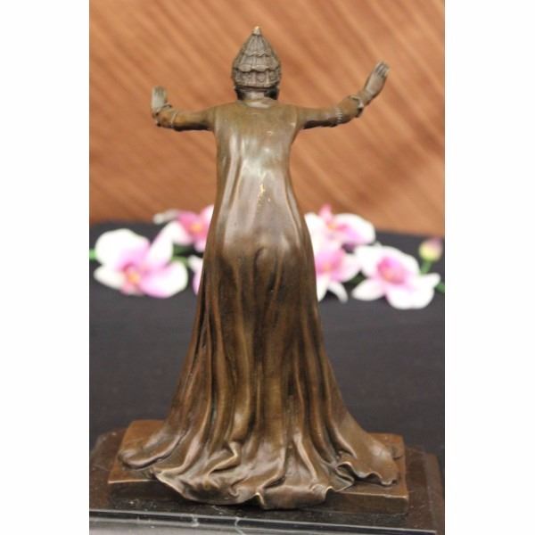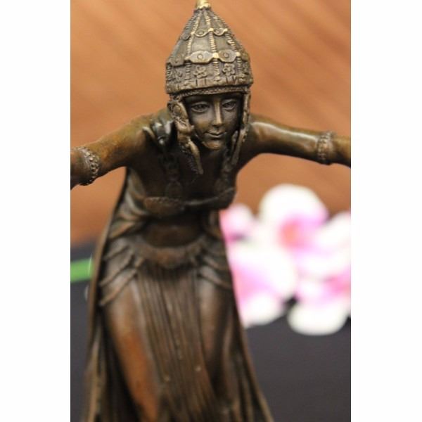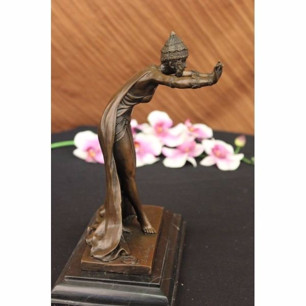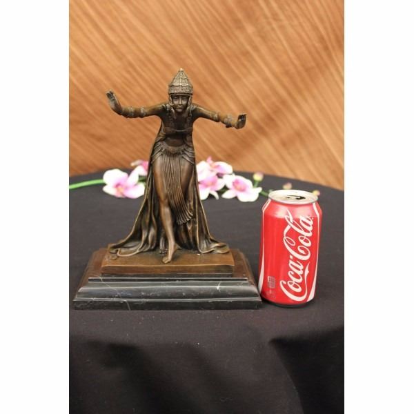 This Egyptian princess bows graciously with her hands out to her side as her long royal flowing dress cascades around down her legs and bunches at her feet. On her head she wears jeweled crown that has flaps that fall down around her face. Her dress has great dimension, with creases, folds, and pleats. She is performing a traditional dance and executes it with the graciousness of a floating hummingbird. This is a one of a kind sculpture and is sure to add a touch of style and grace to any room. This sculpture was cast using the lost wax method and is mounted atop a black beveled marble base. Bronze dimensions with marble base: Height 11 X Width 8 inches. Weight: 10 lbs.Please Note: This is a reproduction bronze sculpture from the original molded and signed. This featured bronze sculpture is a recast after the original, and has been done recently. This 100% bronze sculpture is an abstract piece certain to be a conversation piece.Please Note: This is a reproduction bronze sculpture from the original molded and signed. This featured bronze sculpture is a recast after the original, and has been done recently. This 100% bronze sculpture is an abstract piece certain to be a conversation piece.