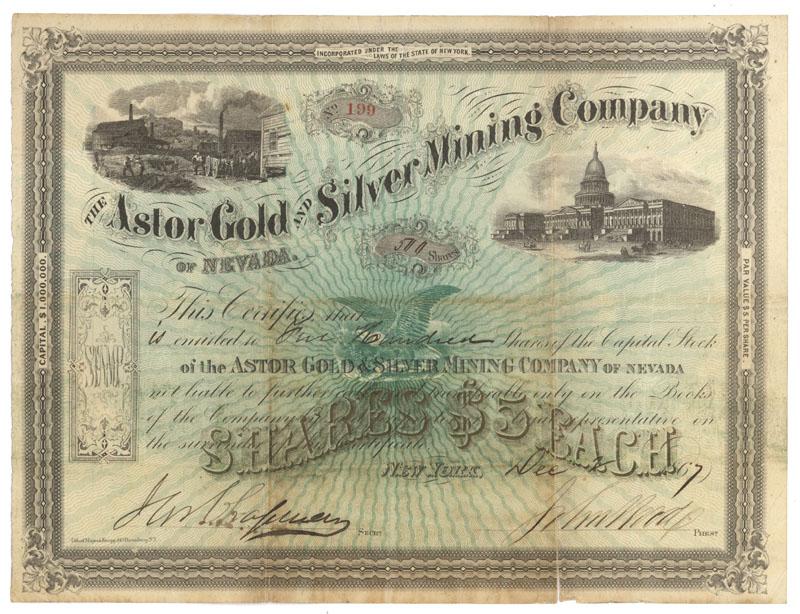 1867, Nevada. Stock certificate for 100 shares. Black/White with green background and green underpirnt of an eagle at center. Vignette of a mining camp at top left and city building at top right. Two vertical folds and three horizontal folds. Overall age toning and stonger toning at folds. Fold split repaired on verso. Uncancelled and good.