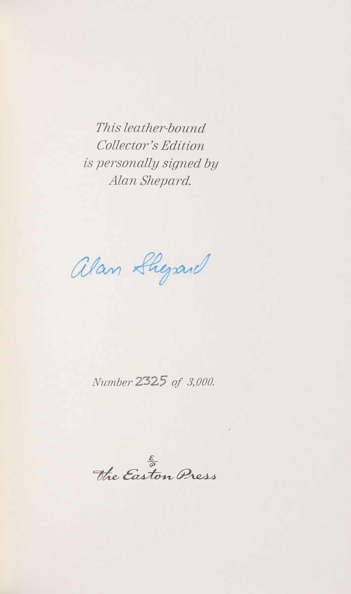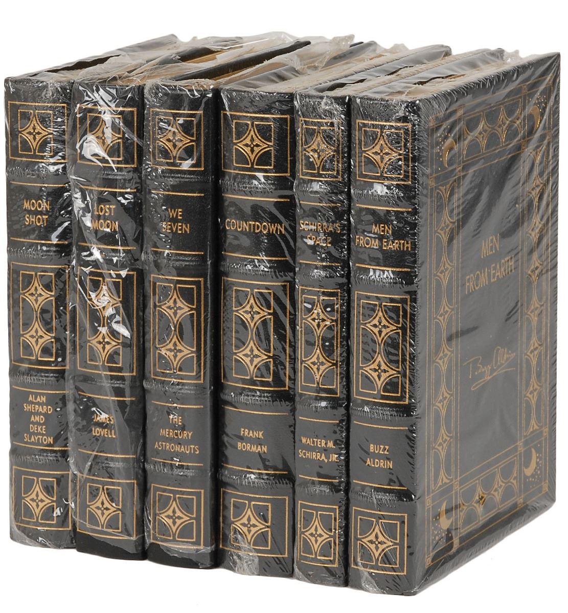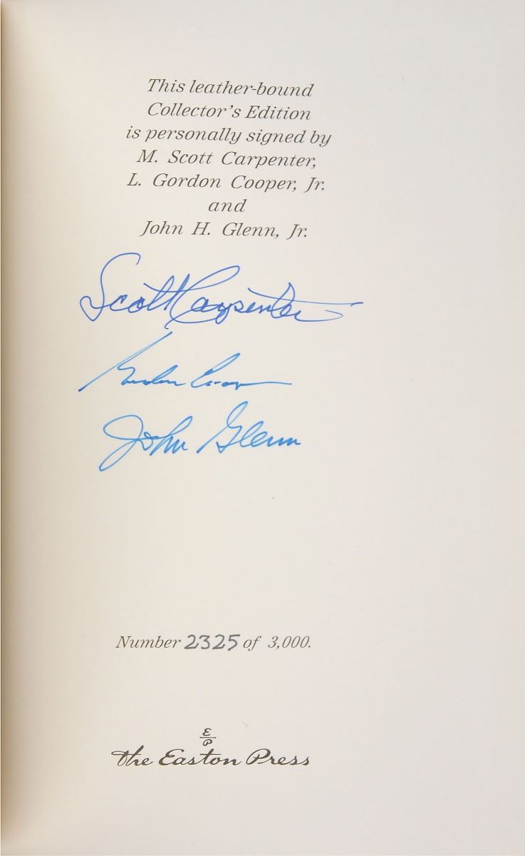 Signed books: a six-volume set of The Astronaut’s Library. Each a limited collector’s edition, numbered 2325/3000. Norwalk, CT: Easton Press. Leather-bound hardcovers, 6.25 x 9.25. Each book signed on the colophon in ink by one or more astronauts. Titles include: Men from Earth (Buzz Aldrin), Lost Moon (James Lovell), Countdown (Frank Borman), Schirra’s Space (Wally Schirra), Moon Shot (Alan Shepard), and We Seven (Scott Carpenter, Gordon Cooper, and John Glenn). In overall very fine condition. All include their original publisher’s certificates of authenticity and shrinkwrap (sliced open). Chronicling the pathways of the Mercury, Gemini, and Apollo programs, this phenomenal collection of books is signed by eight of NASA’s most storied astronauts.