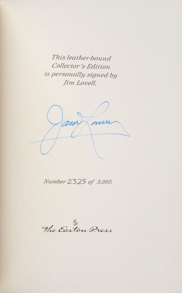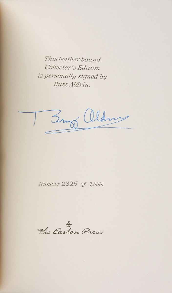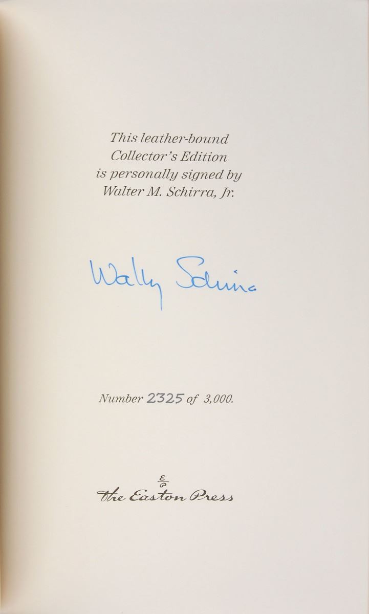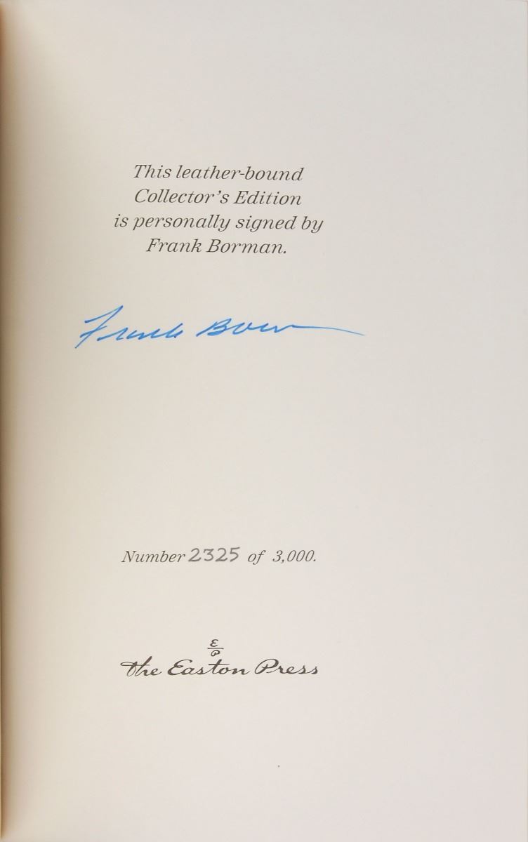 Signed books: a six-volume set of The Astronaut’s Library. Each a limited collector’s edition, numbered 2325/3000. Norwalk, CT: Easton Press. Leather-bound hardcovers, 6.25 x 9.25. Each book signed on the colophon in ink by one or more astronauts. Titles include: Men from Earth (Buzz Aldrin), Lost Moon (James Lovell), Countdown (Frank Borman), Schirra’s Space (Wally Schirra), Moon Shot (Alan Shepard), and We Seven (Scott Carpenter, Gordon Cooper, and John Glenn). In overall very fine condition. All include their original publisher’s certificates of authenticity and shrinkwrap (sliced open). Chronicling the pathways of the Mercury, Gemini, and Apollo programs, this phenomenal collection of books is signed by eight of NASA’s most storied astronauts.