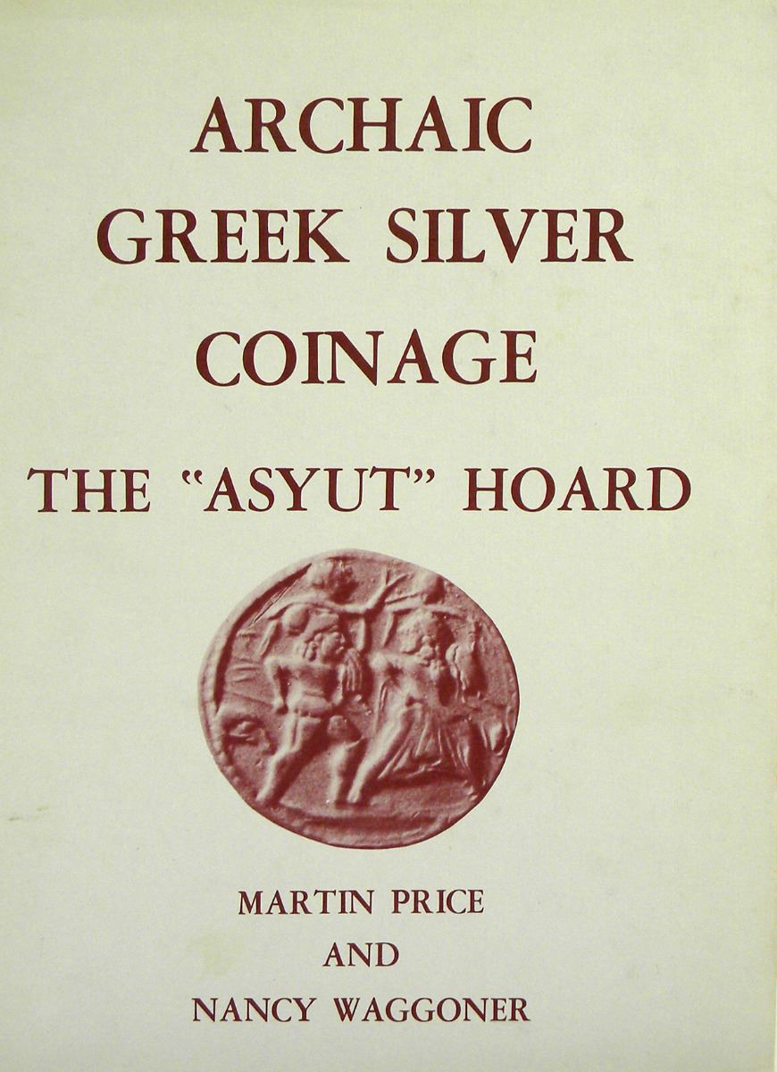 Price, Martin, and Nancy Waggoner. ARCHAIC GREEK COINAGE: THE ASYUT HOARD. London, 1975. Crown 4to, original maroon boards, gilt; jacket. 143, (1) pages; folding map; 4 + 32 plates of coins. Tiny bit of wear to jacket, else fine. Important. Daehn 721. Kroh 31 (four stars).