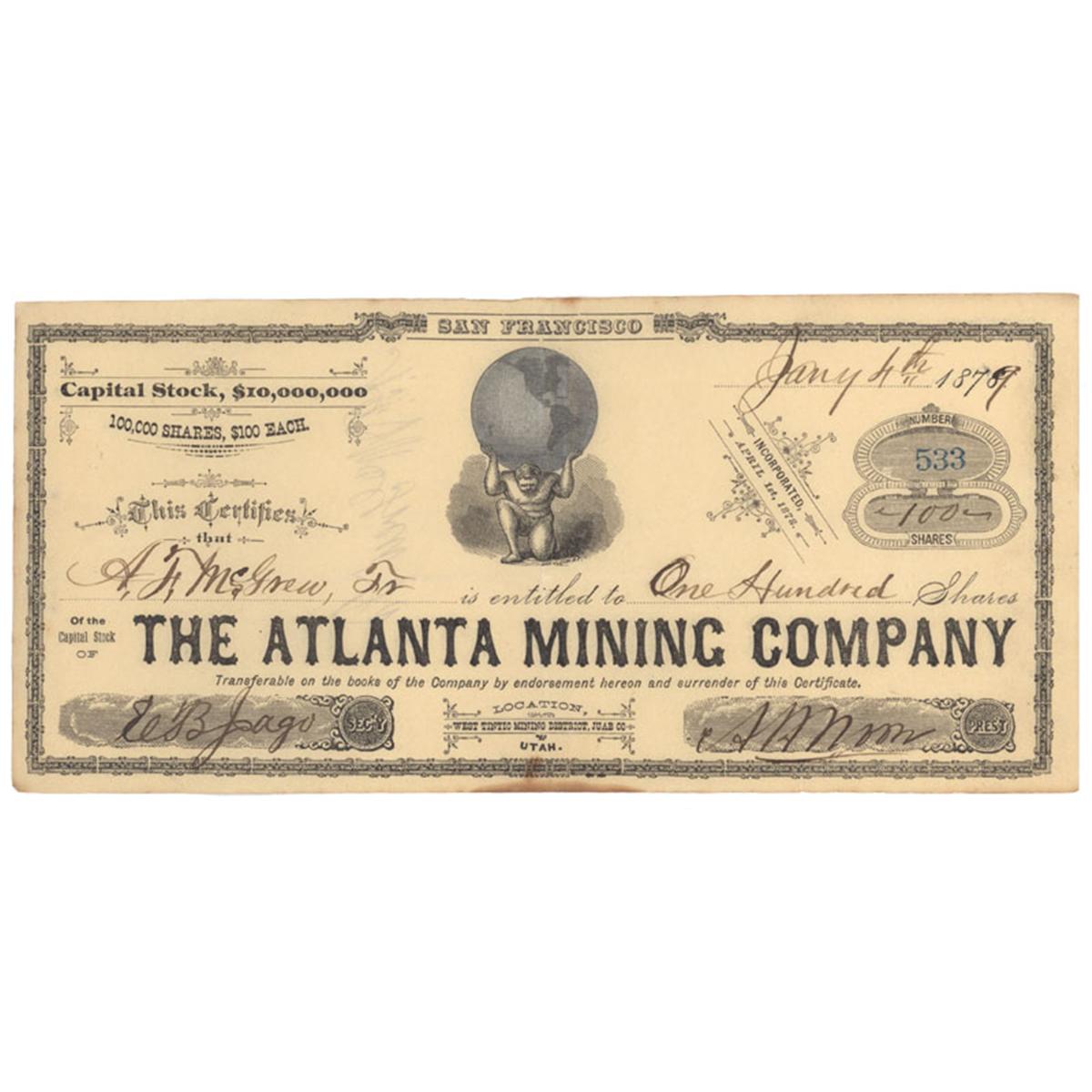 1879, California. Stock certificate for 100 shares. Black. Vignette at top center of Atlas supporting the terrestrial globe. Mines located at West Tintic Mining District, Juab County, Utah. Age toning at bottom margin. Uncancelled and very fine.
