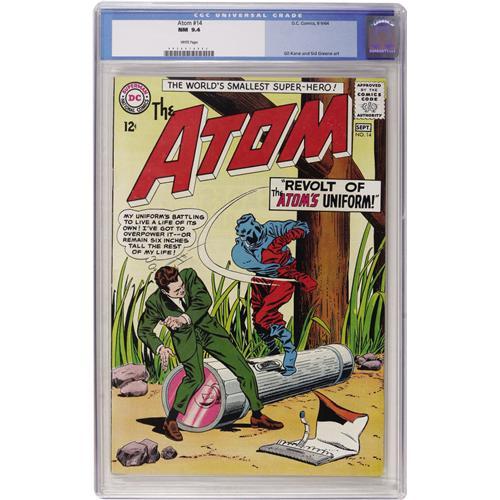 <B>The Atom #14 (DC, 1964) CGC NM 9.4 White pages.</B></I> Gil Kane and Murphy Anderson provided the cover art as usual; inside Kane auditioned a 'new' inker, the old pro Sid Greene. Seen enough "no-higher-grade" copies yet? We're not done yet! This one's a beauty! Overstreet 2006 NM- 9.2 value = $135. CGC census 3/07: 3 in 9.4, none higher.<BR><BR><b>Shipping:</b> Comics - Slabbed (certified) (<a target="_blank" href="http://www.heritageauctions.com/common/shipping.php">view shipping information</a>)