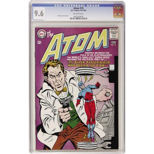 <B>The Atom #15 (DC, 1964) CGC NM+ 9.6 Off-white pages.</B></I> One of just two copies that CGC has certified to date with grades higher than NM- 9.2. Gil Kane cover and art. Overstreet 2006 NM- 9.2 value = $135. CGC census 3/07: 2 in 9.6, none higher.<BR><BR><b>Shipping:</b> Comics - Slabbed (certified) (<a target="_blank" href="http://www.heritageauctions.com/common/shipping.php">view shipping information</a>)