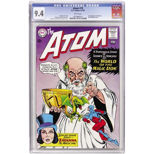<B>The Atom #19 (DC, 1965) CGC NM 9.4 White pages.</B></I> Future Justice Leaguer Zatanna made just her second appearance here (her debut was in a <B>Hawkman</B></I> issue that didn't show her on the cover). Gil Kane drew this issue's cover and story, and there's actually a Marv Wolfman contribution inside, namely a letter to the editor saying the Time Pool stories were unrealistic! Overstreet 2006 NM- 9.2 value = $105. CGC census 3/07: 3 in 9.4, 1 higher.<BR><BR><b>Shipping:</b> Comics - Slabbed (certified) (<a target="_blank" href="http://www.heritageauctions.com/common/shipping.php">view shipping information</a>)