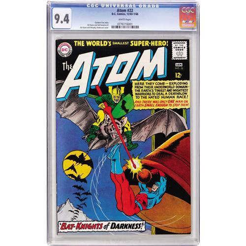 <B>The Atom #22 (DC, 1966) CGC NM 9.4 White pages.</B></I> Gil Kane cover and art. Overstreet 2006 NM- 9.2 value = $90. CGC census 3/07: 3 in 9.4, none higher.<BR><BR><b>Shipping:</b> Comics - Slabbed (certified) (<a target="_blank" href="http://www.heritageauctions.com/common/shipping.php">view shipping information</a>)