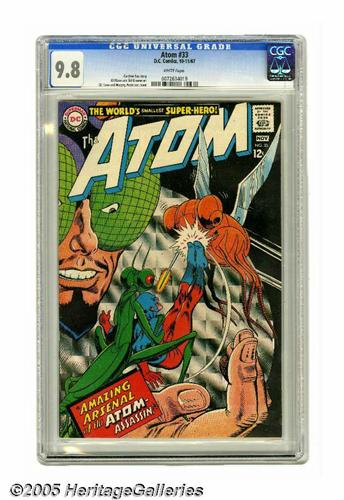 <B>The Atom #33 (DC, 1967) CGC NM/MT 9.8 White pages.</B></I> Gil Kane provided cover and interior art for this adventure of the Mighty Mite. Overstreet 2005 NM- 9.2 value = $70. CGC census 7/05: 2 in 9.8, none higher.