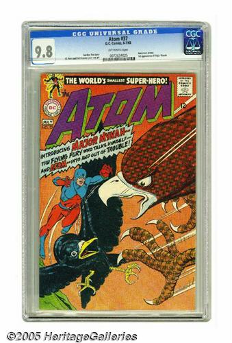 <B>The Atom #37 (DC, 1968) CGC NM/MT 9.8 Off-white pages.</B></I> This issue saw the first appearance of the Atom's talking pet bird, Major Mynah. DC's avian superhero, the Hawkman, puts in a cameo. The cover and art are by Gil Kane. Overstreet 2005 NM- 9.2 value = $70. CGC census 2/05: 1 in 9.8, none higher.