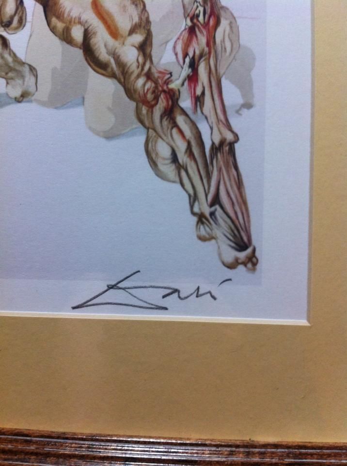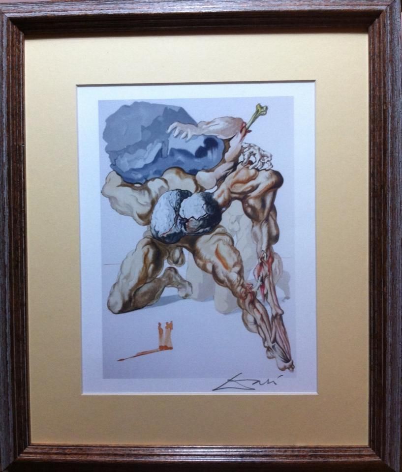 "The Avaricious and the Prodigal" Woodblock signed by Salvador Dali - Spain (1904 - 1989). Framed size is 14" x 16". Salvador Dali Divine Comedy, a poem by Dante Alighieri (1265-1321), was illustrated by Dali between 1951 and 1960. Dali created 101 watercolor drawings to interpret the Salvador Dali Divine Comedy. These works have been reproduced using a wood engraving technique. With this technique, wood engravers carved 3500 blocks for the prints that make up the Salvador Dali Divine Comedy. 100 woodblocks were published as a French edition by two different editors with a total of 4765 books, an Italian edition of 3188, and later in 1974 as a German edition with a stated size of 1000.