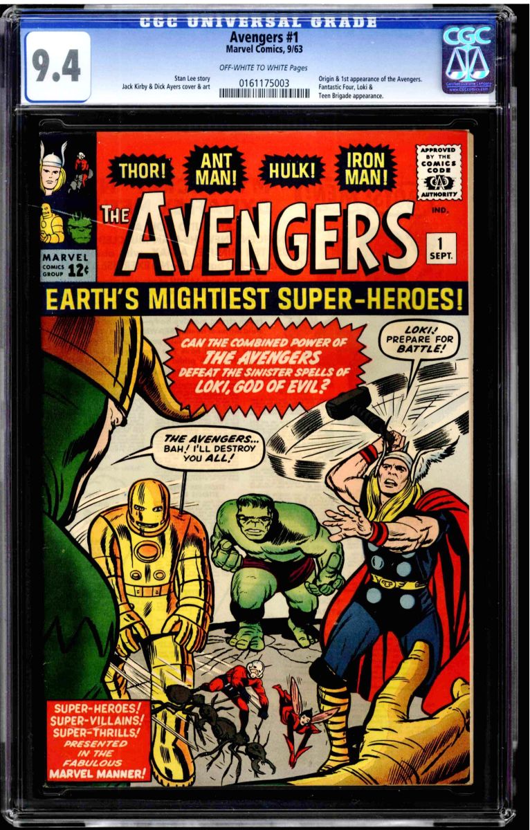 The Avengers #1 CGC 9.4 off white to white pages. This is the introductory issue for the long running comic series "The Avengers" - The Fantastic Four also make an appearance. September 1963, written by Stan Lee and drawn by Jack Kirby, cover by Kirby and Dick Ayers. Cover has minor creasing and very minor edge wear, with good color and reflectivity. Overstreet 2009 NM 9.2 value = $9,200. The CGC universal census reports 5 at 9.4, and only 2 in higher grades. An Avengers #1 in 9.4 has not hit the market since 2002. This comic will be one of the highlights of our auction. You almost never see an Avengers # 1 in this condition for sale.
