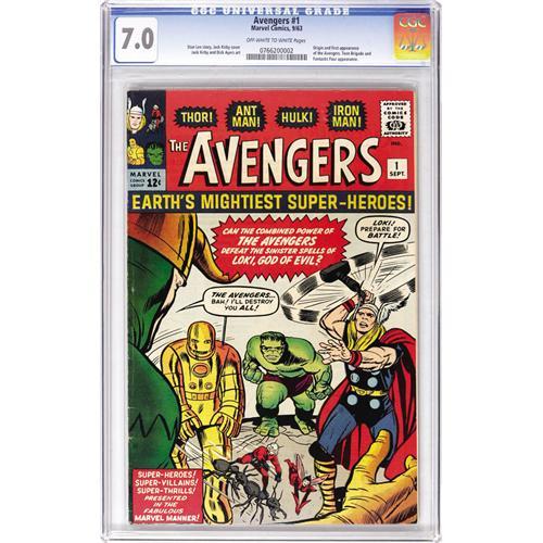 <B>The Avengers #1 (Marvel, 1963) CGC FN/VF 7.0 Off-white to white pages.</B></I> Required reading for every Silver Age fan and a must-own for the serious Silver Age collector, this issue has the origin and first appearance of the Avengers. Jack Kirby handled the cover and interior art. Overstreet 2006 FN 6.0 value = $819; VF 8.0 value = $2,389. CGC census 6/06: 39 in 7.0, 81 higher. <BR><BR><B>Important notice:</B> Heritage usually auctions material at the rate of 200-250 lots per hour. On some occasions eBay Live bid software or the Internet may not be able to keep up with the pace of the auction. We recommend placing a realistic absentee bid now as insurance to avoid disappointment. Occasionally the auctioneer may eliminate or reject an eBay Live bid, and the auctioneer may also reopen a lot after the close of the eBay live bidding (usually because we missed an audience bid), and may reject your bid even if it shows you as the winning bidder. By bidding via eBay Live, you agree that Heritage may award the lot to another bidder at its sole discretion under the circumstances described above or any other reasonable circumstances. Since eBay bids are not shown to us until we open the lot on the floor, we treat those bids just like floor bids. In most cases the floor responds before the eBay bid is presented to us, due to Internet lag time, so for consistency we have made it a policy that floor bids are always considered first over tie eBay live bids. Also please note that all Heritage lots purchased through eBay Live carry a 22.5% Buyer's Premium. Please make sure you read the Terms and Conditions before you bid. This lot is being auctioned in conjunction with a live floor auction by Heritage Auction Galleries. All final auction and invoice information will be supplied by Heritage Auction Galleries, and all other information should be considered preliminary. Lot:41001 <BR><BR><B>Winning Notification and Billing:</B> After the FINAL session in this auction is complete, Heritage will send e-mail and snail mail invoices. This process normally takes several days. All final auction and invoice information will be supplied by Heritage Auction Galleries, and all other information should be considered preliminary. <BR><BR>This auction will be conducted on a live auction floor and over the Internet through eBay Live. If you choose to place an absentee bid, please take a moment to <font color='#0000ff'><u><a href='http://pages.ebay.com/liveauctions/help/before/laabsentee.html'>learn how eBay Live absentee bidding works</a></u></font><font color='#000000'>