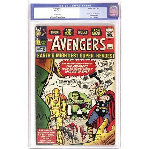 <B>The Avengers #1 (Marvel, 1963) CGC VF- 7.5 Off-white pages.</B></I> New titles were coming fast and furiously from Stan Lee's House of Ideas in 1963. One of the more notable was this premiere issue that featured every self-respecting superhero that Marvel had introduced to date not named the Amazing Spider-Man. Thor wields his hammer, Iron Man shows up in his older bulky outfit, Ant Man and the Wasp do their thing, the Hulk shows up (evidently by mistake, since he sticks around until only the second issue) - even the Fantastic Four appear! Then there's Loki, the Teen Brigade, and we thought we noted the Doublemint Twins in the background! Jack Kirby provided the cover and interior art. Overstreet 2006 VF 8.0 value = $2,389. CGC census 7/06:23 in 7.5, 58 higher. <BR><BR><B>Important notice:</B> Heritage usually auctions material at the rate of 200-250 lots per hour. On some occasions eBay Live bid software or the Internet may not be able to keep up with the pace of the auction. We recommend placing a realistic absentee bid now as insurance to avoid disappointment. Occasionally the auctioneer may eliminate or reject an eBay Live bid, and the auctioneer may also reopen a lot after the close of the eBay live bidding (usually because we missed an audience bid), and may reject your bid even if it shows you as the winning bidder. By bidding via eBay Live, you agree that Heritage may award the lot to another bidder at its sole discretion under the circumstances described above or any other reasonable circumstances. Since eBay bids are not shown to us until we open the lot on the floor, we treat those bids just like floor bids. In most cases the floor responds before the eBay bid is presented to us, due to Internet lag time, so for consistency we have made it a policy that floor bids are always considered first over tie eBay live bids. Also please note that all Heritage lots purchased through eBay Live carry a 22.5% Buyer's Premium. Please make sure you read the Terms and Conditions before you bid. This lot is being auctioned in conjunction with a live floor auction by Heritage Auction Galleries. All final auction and invoice information will be supplied by Heritage Auction Galleries, and all other information should be considered preliminary. Lot:41001 <BR><BR><B>Winning Notification and Billing:</B> After the FINAL session in this auction is complete, Heritage will send e-mail and snail mail invoices. This process normally takes several days. All final auction and invoice information will be supplied by Heritage Auction Galleries, and all other information should be considered preliminary. <BR><BR>This auction will be conducted on a live auction floor and over the Internet through eBay Live. If you choose to place an absentee bid, please take a moment to <font color='#0000ff'><u><a href='http://pages.ebay.com/liveauctions/help/before/laabsentee.html'>learn how eBay Live absentee bidding works</a></u></font><font color='#000000'>