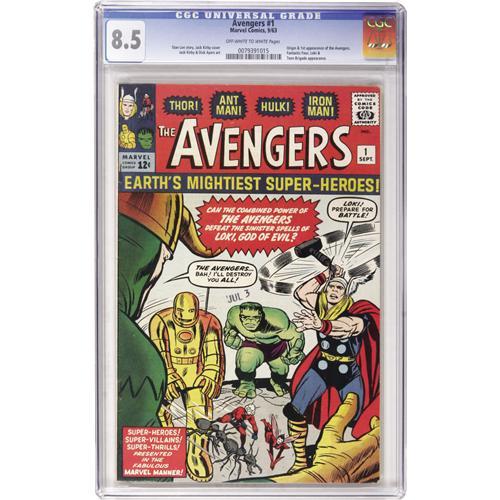 <B>The Avengers #1 (Marvel, 1963) CGC VF+ 8.5 Off-white to white pages.</B></I> It's the origin and first appearance of the Avengers, Marvel's <I>improvement</B></I> on the Justice League concept (we gotta tell it like it is!). Artist Jack Kirby teamed with writer Stan Lee on this milestone. A VF+ copy doesn't come along every day! Overstreet 2006 VF 8.0 value = $2,389; VF/NM 9.0 value = $4,195. CGC census 3/07: 20 in 8.5, 21 higher.<BR><BR><b>Shipping:</b> Comics - Slabbed (certified) (<a target="_blank" href="http://www.heritageauctions.com/common/shipping.php">view shipping information</a>)