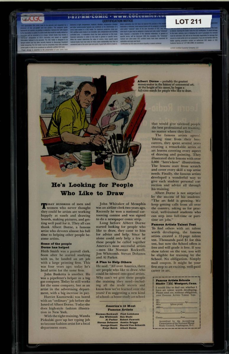 The Auctioneer has reserved the right to reject any and all bids, and to bid at the auction. Auctioneers Auctions are not on approval. Auctioneer does not allow certified material to be returned because of possible differences of opinion with respect to the grade offered by any third party organization, dealer, or service. Absolutely no guarantee of grade is offered for un-certified property sold and subsequently submitted to a third-party grading service. There will be no exceptions to this policy. Under extremely limited circumstances, (e.g. gross cataloging error) a purchaser, who did not bid from the floor, may request Auctioneer to evaluate voiding a sale; such request must be made in writing detailing the alleged gross error, and submission of the lot to the Auctioneer must be pre-approved by the Auctioneer. Bidder must notify Auctioneer in writing of such request within three (3) days of the non-floor bidder receipt of the lot. Any lot that is to be evaluated must be in our offices within 30 days after Auction. Grading does not qualify for this evaluation process nor do such complaints constitute a basis to challenge the authenticity of a lot. AFTER THAT 30-DAY PERIOD, NO LOTS MAY BE RETURNED FOR REASONS OTHER THAN AUTHENTICITY. Lots returned must be housed intact in the original holder. No lots purchased by floor Bidders may be returned (including those Bidders acting as agents for others). Late remittance for purchases may be considered just cause to revoke all return privileges. B: Auctions conducted solely on the Internet have a THREE (3) DAY RETURN POLICY: Lots paid for within seven days of the Auction closing are sold with a three (3) day return privilege. You may return lots under the following conditions: Within three days of receipt of the lot, you must first notify Auctioneer by contacting Client Service by phone (314-680-8599) or e-mail (moundcityauctions@gmail.com), and immediately mail the lot(s) fully insured to the attention of Returns, Mound City Auctions 1081 Teson Rd. Hazelwood, MO. 63042. Lots must be housed intact in their original holder and in their original condition. You are responsible for the insured, safe delivery of any lots. Auctioneer will not be responsible for lots returned in non-registered mail or lots returned without prior authorization per section B. A non-negotiable return fee of 5% of the purchase price ($10 per lot minimum) will be deducted from the refund for each returned lot or billed directly. Postage and handling fees are not refunded. After the three-day period (from receipt), no items may be returned for any reason. Late remittance for purchases revokes all Return-Restock privileges. C: Bidders who have inspected the lots prior to the auction will not be granted any return privileges. D: Comic books sold referencing a third-party grading service are sold “as is” without any express or implied warranty. Certain warranties may be available from the grading services and the Bidder is referred to them for further details: Certified Guaranty Company, LLC. (CGC), P.O. Box 4738, Sarasota, FL 34230. E: Bidders who intend to challenge authenticity or provenance of a lot must notify Auctioneer in writing within thirty (30) days of the Auctions conclusion. In the event Auctioneer cannot deliver the lot or subsequently it is established that the lot lacks title, provenance, authenticity, or other transfer or condition issue is claimed, Auctioneer's liability shall be limited to rescission of sale and refund of purchase price; in no case shall Auctioneer's maximum liability exceed the high bid on that lot, which bid shall be deemed for all purposes the value of the lot. After one year has elapsed, Auctioneer's maximum liability shall be limited to any commissions and fees Auctioneer earned on that lot. F: All comics are guaranteed genuine, but are not guaranteed as to grade, since grading is a matter of opinion, an art and not a science, and therefore the opinion rendered by the Auctioneer or any third party grading service may not agree with the opinion of others (including trained experts), and the same expert may not grade the same item with the same grade at two different times. G: Since we cannot examine encapsulated comics, they are sold “as is”without our grading opinion, and may not be returned for any reason. Auctioneer shall not be liable for any patent or latent defect or controversy pertaining to or arising from any encapsulated collectible. In any such instance, purchaser's remedy, if any, shall be solely against the service certifying the collectible. H: Due to changing grading standards over time, differing interpretations, and to possible mishandling of items by subsequent owners, Auctioneer reserves the right to grade items differently than shown on certificates from any grading service that accompany the items. Auctioneer also reserves the right to grade items differently than the grades shown in the prior catalog should such items be reconsigned to any future auction. I: Although consensus grading is employed by most grading services, it should be noted as aforesaid that grading is not an exact science. In fact, it is entirely possible that if a lot is broken out of a plastic holder and resubmitted to another grading service or even to the same service, the lot could come back with a different grade assigned. J: Certification does not guarantee protection against the normal risks associated with potentially volatile markets. The degree of liquidity for certified collectibles will vary according to general market conditions and the particular lot involved. For some lots there may be no active market at all at certain points in time."