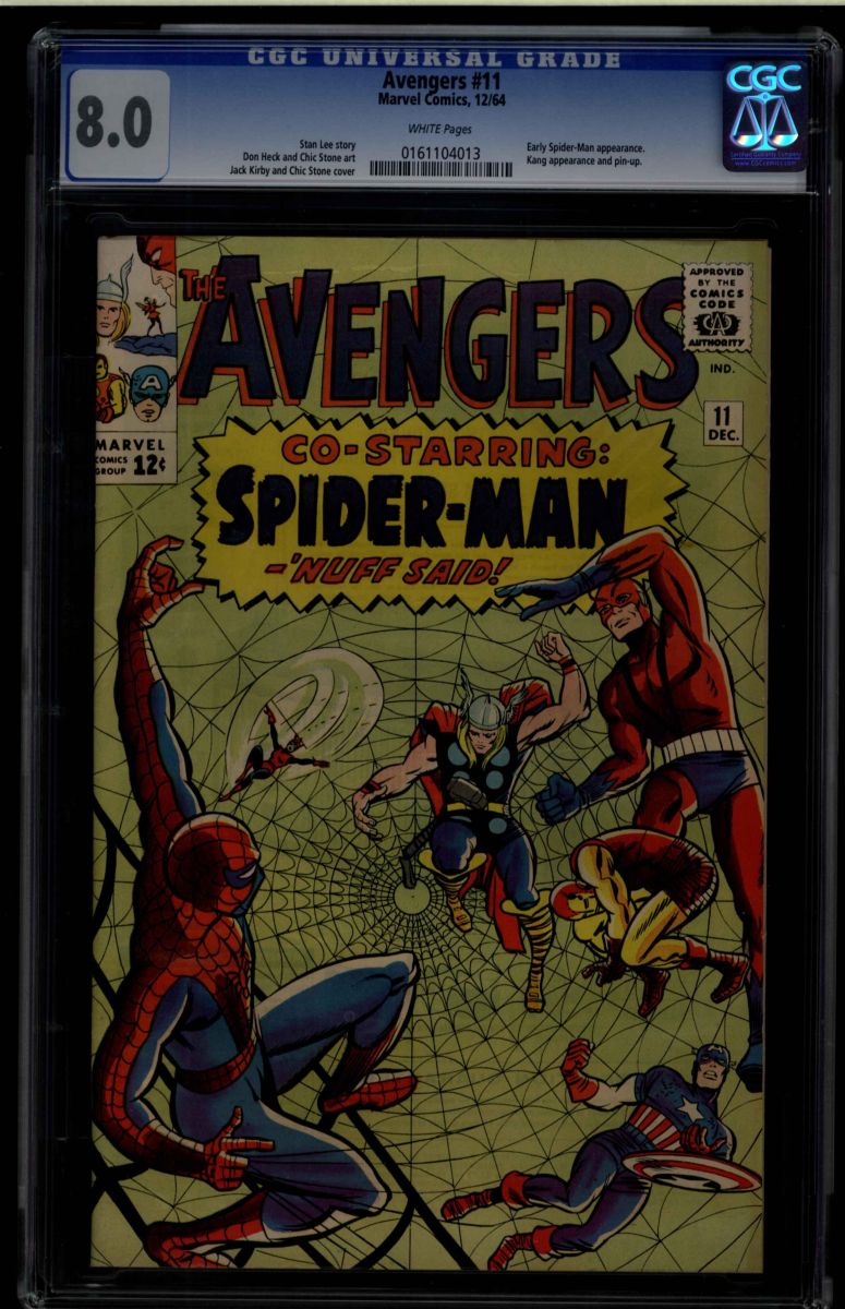The Avengers #11 CGC 8.0 white pages. Stan Lee story. Don Heck and Chic Stone art, Jack Kirby and Chic Stone cover. Kang appearance and pin-up. Early Spider-Man appearance. Overstreet 2009 VF 8.0 value = $239. CGC census: 32 at 8.0, 122 higher.