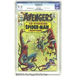 <B>The Avengers #11 (Marvel, 1964) CGC NM- 9.2 Off-white pages.</B></I> Having dispatched Immortus in the previous issue, the Avengers take on the villainy of Kang... waaait, aren't Kang and Immortus the same guy? Who cares, it's all a good excuse to involve the amazing Spider-Man, who meets the Avengers for the very first time in this entertaining yarn. The cover is by Jack Kirby, and the story is from the pencil of Don Heck. Overstreet 2004 NM- 9.2 value = $360. <BR><BR><B>Important notice:</B> Heritage usually auctions material at the rate of 200-250 lots per hour. On some occasions eBay Live bid software or the Internet may not be able to keep up with the pace of the auction. We recommend placing a realistic absentee bid now as insurance to avoid disappointment. Occasionally the auctioneer may eliminate or reject an eBay Live bid, and the auctioneer may also reopen a lot after the close of the eBay live bidding (usually because we missed an audience bid), and may reject your bid even if it shows you as the winning bidder. By bidding via eBay Live, you agree that Heritage may award the lot to another bidder at its sole discretion under the circumstances described above or any other reasonable circumstances. Since eBay bids are not shown to us until we open the lot on the floor, we treat those bids just like floor bids. In most cases the floor responds before the eBay bid is presented to us, due to Internet lag time, so for consistency we have made it a policy that floor bids are always considered first over tie eBay live bids. Also please note that all Heritage lots purchased through eBay Live carry a 20% Buyer's Premium. Please make sure you read the Terms and Conditions before you bid. </span></font></tr></table></td></tr></table>