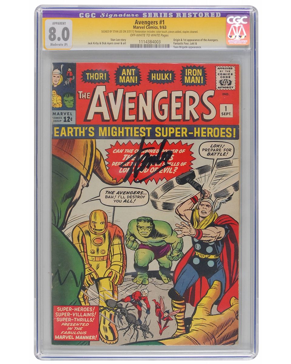 The Avengers #1, signed on the front cover in black felt tip by Stan Lee (Marvel, 1963) CGC Signature Series Restored/Apparent VF 8.0 Moderate (P) Off-white to white pages. An extremely desirable title signed by the hero’s creator and Marvel legend.