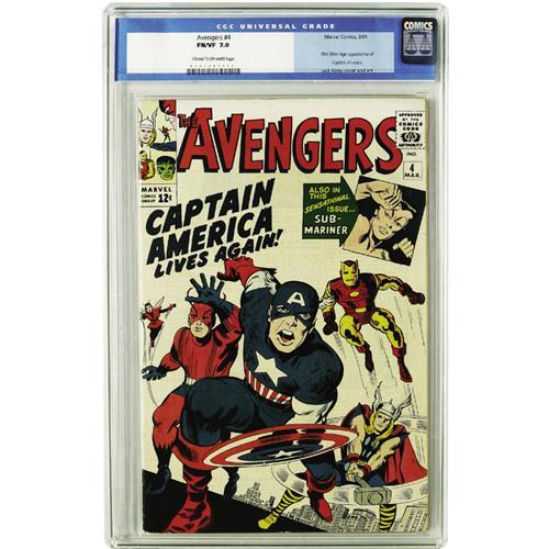 <B>The Avengers #4 (Marvel, 1964) CGC FN/VF 7.0 Cream to off-white pages.</B></I> First Silver Age appearance of Captain America, who joins the Avengers. Sub-Mariner appearance. Jack Kirby cover and art. Overstreet 2006 FN 6.0 value = $405; VF 8.0 value = $1,148. CGC census 3/06: 52 in 7.0, 186 higher.
