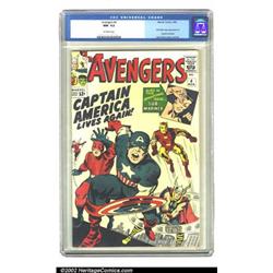 The Avengers #4 (Marvel, 1964) CGC NM- 9.2 Off-white pages. This is undeniably one of the most important issues of the Silver Age. It reintroduces Captain America to the Marvel Universe and features one of the most recognizable covers from the time period. This issue tells of the ill-fated ride on Baron Zemo's rocket that killed Bucky Barnes and sent Captain America into suspended animation near the end of WWII. This beautiful copy will be enjoyed as a favorite from among even the best collection. Overstreet 2002 NM 9.4 value = $2,300. Important notice: We expect to be auctioning lots at the rate of 200-250 per hour. Sometimes eBay Premier live bid software cannot keep up with that pace, so we strongly recommend that you place a realistic proxy bid now as insurance to avoid disappointment. Also please note that all Heritage/CAA lots purchased through eBay Premier carry a 20% Buyer's Premium. Please make sure you read the Terms and Conditions.