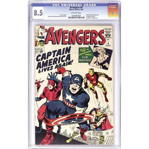 <B>The Avengers #4 (Marvel, 1964) CGC VF+ 8.5 Off-white pages.</B></I> A very undervalued book in our opinion, this issue, the first modern appearance of Captain America, is certainly one of the most significant comics of Marvel's Silver Age - can it be long before the value follows suit? The Sub-Mariner also appears in this issue, which has a Jack Kirby cover and interior art. Overstreet 2006 VF 8.0 value = $1,148; VF/NM 9.0 value = $1,924. CGC census 5/06: 16 in 8.5, 74 higher. <BR><BR><B>Important notice:</B> Heritage usually auctions material at the rate of 200-250 lots per hour. On some occasions eBay Live bid software or the Internet may not be able to keep up with the pace of the auction. We recommend placing a realistic absentee bid now as insurance to avoid disappointment. Occasionally the auctioneer may eliminate or reject an eBay Live bid, and the auctioneer may also reopen a lot after the close of the eBay live bidding (usually because we missed an audience bid), and may reject your bid even if it shows you as the winning bidder. By bidding via eBay Live, you agree that Heritage may award the lot to another bidder at its sole discretion under the circumstances described above or any other reasonable circumstances. Since eBay bids are not shown to us until we open the lot on the floor, we treat those bids just like floor bids. In most cases the floor responds before the eBay bid is presented to us, due to Internet lag time, so for consistency we have made it a policy that floor bids are always considered first over tie eBay live bids. Also please note that all Heritage lots purchased through eBay Live carry a 22.5% Buyer's Premium. Please make sure you read the Terms and Conditions before you bid. This lot is being auctioned in conjunction with a live floor auction by Heritage Auction Galleries. All final auction and invoice information will be supplied by Heritage Auction Galleries, and all other information should be considered preliminary. Lot:41001 <BR><BR><B>Winning Notification and Billing:</B> After the FINAL session in this auction is complete, Heritage will send e-mail and snail mail invoices. This process normally takes several days. All final auction and invoice information will be supplied by Heritage Auction Galleries, and all other information should be considered preliminary. <BR><BR>This auction will be conducted on a live auction floor and over the Internet through eBay Live. If you choose to place an absentee bid, please take a moment to <font color='#0000ff'><u><a href='http://pages.ebay.com/liveauctions/help/before/laabsentee.html'>learn how eBay Live absentee bidding works</a></u></font><font color='#000000'>
