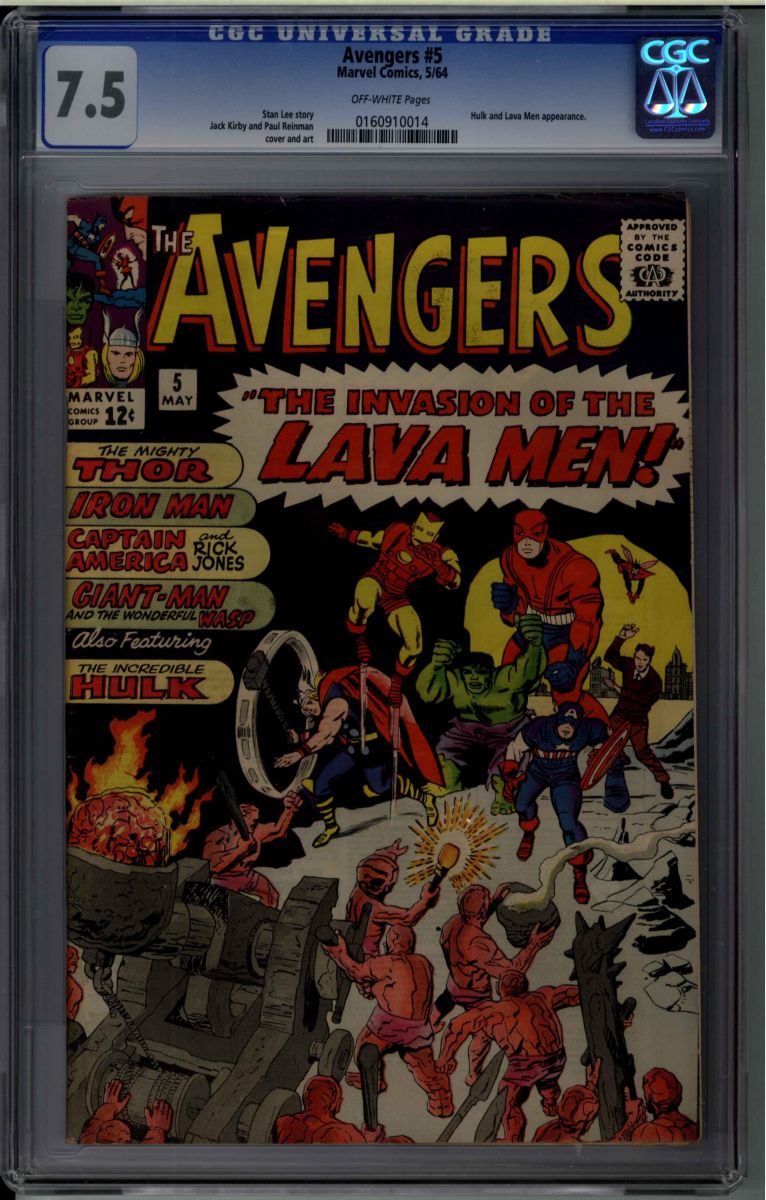 The Avengers #5 CGC 7.5 off-white pages. Creasing on the spine and a minor tear above the "V" in "Avengers" on the cover, roughing to corners. Written by Stan Lee, penciled by Jack Kirby, inked by Paul Reinman, lettered by Sam Rosen, cover by Sol Brodsky and Jack Kirby. Hulk and Lava Men appearance. Overstreet 2009 FN 6.0 value = $117; VF 8.0 value = $300. CGC census: 16 at 7.5, 86 higher.