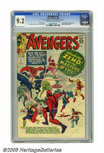 <B>The Avengers #6 (Marvel, 1964) CGC NM- 9.2 Cream to off-white pages.</B></I> The Avengers encounter the "original" Zemo and his Masters of Evil. Jack Kirby and Chic Stone provide the art. Overstreet 2005 NM- 9.2 value = $350. CGC census 7/05: 18 in 9.2, 8 higher. <I>From the collection of Joe and Nadia Mannarino</B></I>.