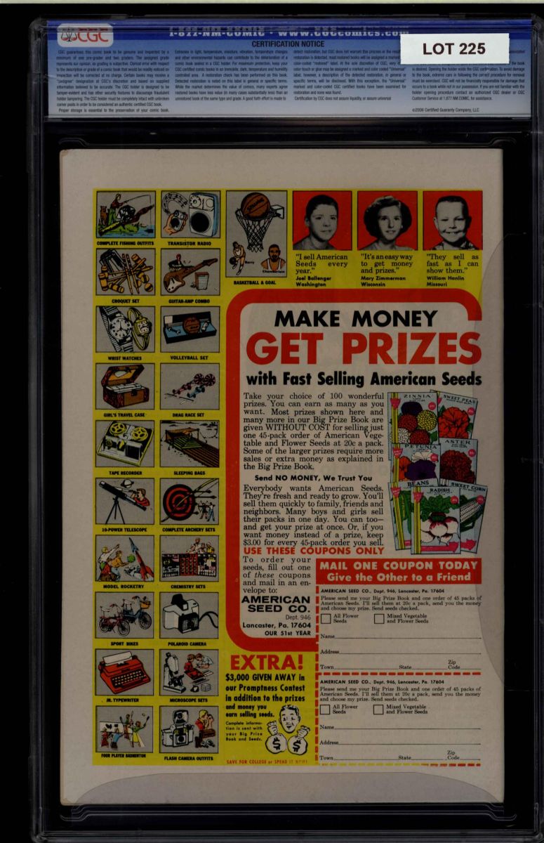 The Auctioneer has reserved the right to reject any and all bids, and to bid at the auction. Auctioneers Auctions are not on approval. Auctioneer does not allow certified material to be returned because of possible differences of opinion with respect to the grade offered by any third party organization, dealer, or service. Absolutely no guarantee of grade is offered for un-certified property sold and subsequently submitted to a third-party grading service. There will be no exceptions to this policy. Under extremely limited circumstances, (e.g. gross cataloging error) a purchaser, who did not bid from the floor, may request Auctioneer to evaluate voiding a sale; such request must be made in writing detailing the alleged gross error, and submission of the lot to the Auctioneer must be pre-approved by the Auctioneer. Bidder must notify Auctioneer in writing of such request within three (3) days of the non-floor bidder receipt of the lot. Any lot that is to be evaluated must be in our offices within 30 days after Auction. Grading does not qualify for this evaluation process nor do such complaints constitute a basis to challenge the authenticity of a lot. AFTER THAT 30-DAY PERIOD, NO LOTS MAY BE RETURNED FOR REASONS OTHER THAN AUTHENTICITY. Lots returned must be housed intact in the original holder. No lots purchased by floor Bidders may be returned (including those Bidders acting as agents for others). Late remittance for purchases may be considered just cause to revoke all return privileges. B: Auctions conducted solely on the Internet have a THREE (3) DAY RETURN POLICY: Lots paid for within seven days of the Auction closing are sold with a three (3) day return privilege. You may return lots under the following conditions: Within three days of receipt of the lot, you must first notify Auctioneer by contacting Client Service by phone (314-680-8599) or e-mail (moundcityauctions@gmail.com), and immediately mail the lot(s) fully insured to the attention of Returns, Mound City Auctions 1081 Teson Rd. Hazelwood, MO. 63042. Lots must be housed intact in their original holder and in their original condition. You are responsible for the insured, safe delivery of any lots. Auctioneer will not be responsible for lots returned in non-registered mail or lots returned without prior authorization per section B. A non-negotiable return fee of 5% of the purchase price ($10 per lot minimum) will be deducted from the refund for each returned lot or billed directly. Postage and handling fees are not refunded. After the three-day period (from receipt), no items may be returned for any reason. Late remittance for purchases revokes all Return-Restock privileges. C: Bidders who have inspected the lots prior to the auction will not be granted any return privileges. D: Comic books sold referencing a third-party grading service are sold “as is” without any express or implied warranty. Certain warranties may be available from the grading services and the Bidder is referred to them for further details: Certified Guaranty Company, LLC. (CGC), P.O. Box 4738, Sarasota, FL 34230. E: Bidders who intend to challenge authenticity or provenance of a lot must notify Auctioneer in writing within thirty (30) days of the Auctions conclusion. In the event Auctioneer cannot deliver the lot or subsequently it is established that the lot lacks title, provenance, authenticity, or other transfer or condition issue is claimed, Auctioneer's liability shall be limited to rescission of sale and refund of purchase price; in no case shall Auctioneer's maximum liability exceed the high bid on that lot, which bid shall be deemed for all purposes the value of the lot. After one year has elapsed, Auctioneer's maximum liability shall be limited to any commissions and fees Auctioneer earned on that lot. F: All comics are guaranteed genuine, but are not guaranteed as to grade, since grading is a matter of opinion, an art and not a science, and therefore the opinion rendered by the Auctioneer or any third party grading service may not agree with the opinion of others (including trained experts), and the same expert may not grade the same item with the same grade at two different times. G: Since we cannot examine encapsulated comics, they are sold “as is”without our grading opinion, and may not be returned for any reason. Auctioneer shall not be liable for any patent or latent defect or controversy pertaining to or arising from any encapsulated collectible. In any such instance, purchaser's remedy, if any, shall be solely against the service certifying the collectible. H: Due to changing grading standards over time, differing interpretations, and to possible mishandling of items by subsequent owners, Auctioneer reserves the right to grade items differently than shown on certificates from any grading service that accompany the items. Auctioneer also reserves the right to grade items differently than the grades shown in the prior catalog should such items be reconsigned to any future auction. I: Although consensus grading is employed by most grading services, it should be noted as aforesaid that grading is not an exact science. In fact, it is entirely possible that if a lot is broken out of a plastic holder and resubmitted to another grading service or even to the same service, the lot could come back with a different grade assigned. J: Certification does not guarantee protection against the normal risks associated with potentially volatile markets. The degree of liquidity for certified collectibles will vary according to general market conditions and the particular lot involved. For some lots there may be no active market at all at certain points in time."