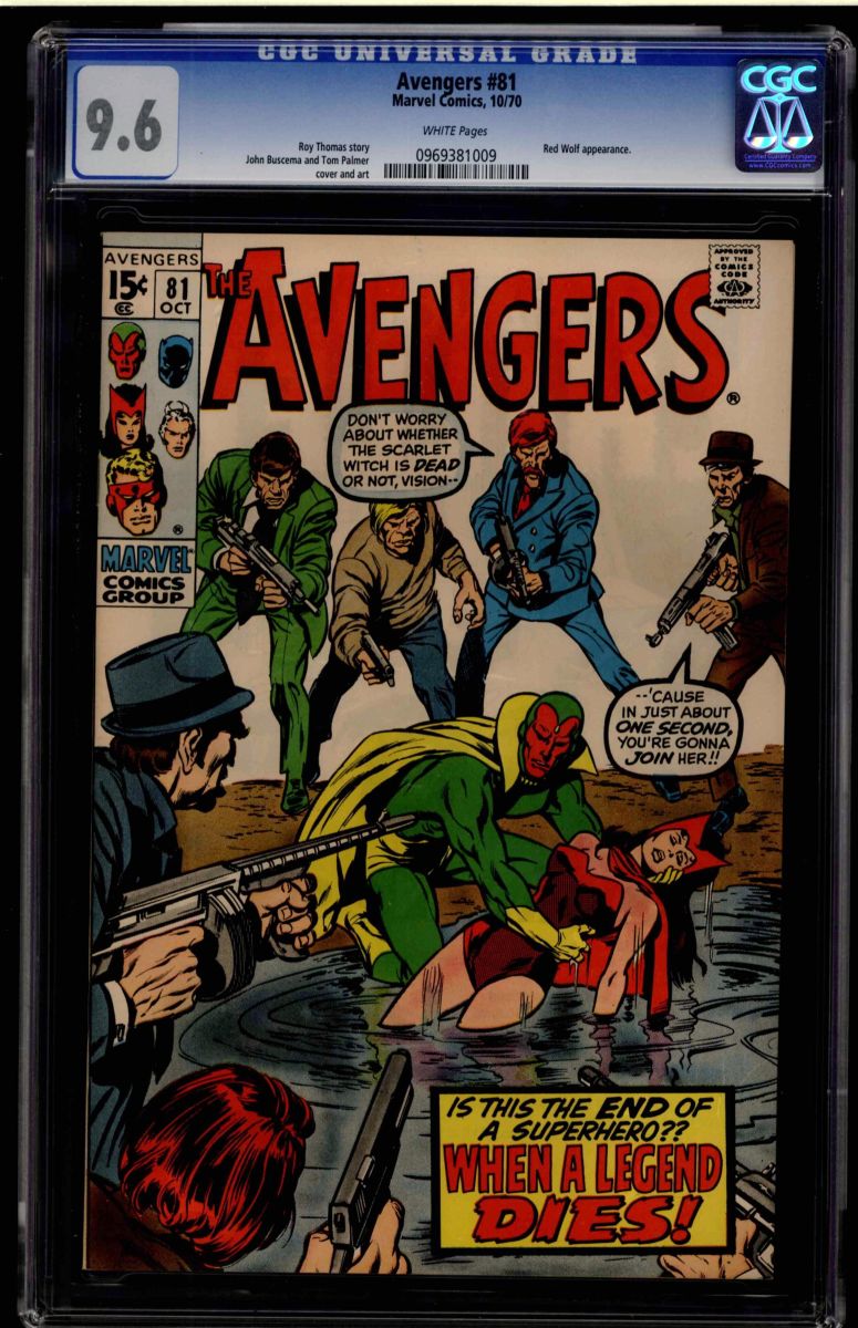 CGC 9.6 White, "When Dies A Legend!" Written by Roy Thomas, art by John Buscema and Thomas Palmer Sr, edited by Stan Lee. October 1970, Red Wolf appearance. Overstreet 2009 NM 9.2 value = $60. CGC census: 11 at 9.6, 4 higher.