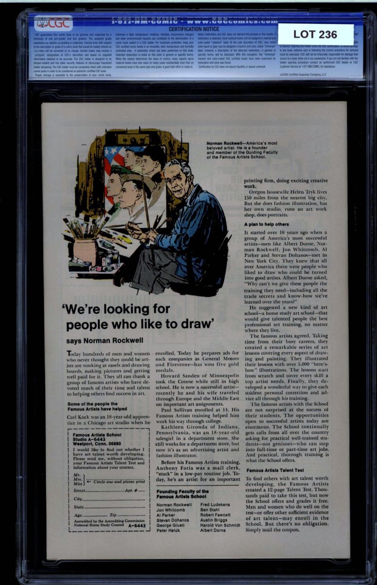 The Auctioneer has reserved the right to reject any and all bids, and to bid at the auction. Auctioneers Auctions are not on approval. Auctioneer does not allow certified material to be returned because of possible differences of opinion with respect to the grade offered by any third party organization, dealer, or service. Absolutely no guarantee of grade is offered for un-certified property sold and subsequently submitted to a third-party grading service. There will be no exceptions to this policy. Under extremely limited circumstances, (e.g. gross cataloging error) a purchaser, who did not bid from the floor, may request Auctioneer to evaluate voiding a sale; such request must be made in writing detailing the alleged gross error, and submission of the lot to the Auctioneer must be pre-approved by the Auctioneer. Bidder must notify Auctioneer in writing of such request within three (3) days of the non-floor bidder receipt of the lot. Any lot that is to be evaluated must be in our offices within 30 days after Auction. Grading does not qualify for this evaluation process nor do such complaints constitute a basis to challenge the authenticity of a lot. AFTER THAT 30-DAY PERIOD, NO LOTS MAY BE RETURNED FOR REASONS OTHER THAN AUTHENTICITY. Lots returned must be housed intact in the original holder. No lots purchased by floor Bidders may be returned (including those Bidders acting as agents for others). Late remittance for purchases may be considered just cause to revoke all return privileges. B: Auctions conducted solely on the Internet have a THREE (3) DAY RETURN POLICY: Lots paid for within seven days of the Auction closing are sold with a three (3) day return privilege. You may return lots under the following conditions: Within three days of receipt of the lot, you must first notify Auctioneer by contacting Client Service by phone (314-680-8599) or e-mail (moundcityauctions@gmail.com), and immediately mail the lot(s) fully insured to the attention of Returns, Mound City Auctions 1081 Teson Rd. Hazelwood, MO. 63042. Lots must be housed intact in their original holder and in their original condition. You are responsible for the insured, safe delivery of any lots. Auctioneer will not be responsible for lots returned in non-registered mail or lots returned without prior authorization per section B. A non-negotiable return fee of 5% of the purchase price ($10 per lot minimum) will be deducted from the refund for each returned lot or billed directly. Postage and handling fees are not refunded. After the three-day period (from receipt), no items may be returned for any reason. Late remittance for purchases revokes all Return-Restock privileges. C: Bidders who have inspected the lots prior to the auction will not be granted any return privileges. D: Comic books sold referencing a third-party grading service are sold “as is” without any express or implied warranty. Certain warranties may be available from the grading services and the Bidder is referred to them for further details: Certified Guaranty Company, LLC. (CGC), P.O. Box 4738, Sarasota, FL 34230. E: Bidders who intend to challenge authenticity or provenance of a lot must notify Auctioneer in writing within thirty (30) days of the Auctions conclusion. In the event Auctioneer cannot deliver the lot or subsequently it is established that the lot lacks title, provenance, authenticity, or other transfer or condition issue is claimed, Auctioneer's liability shall be limited to rescission of sale and refund of purchase price; in no case shall Auctioneer's maximum liability exceed the high bid on that lot, which bid shall be deemed for all purposes the value of the lot. After one year has elapsed, Auctioneer's maximum liability shall be limited to any commissions and fees Auctioneer earned on that lot. F: All comics are guaranteed genuine, but are not guaranteed as to grade, since grading is a matter of opinion, an art and not a science, and therefore the opinion rendered by the Auctioneer or any third party grading service may not agree with the opinion of others (including trained experts), and the same expert may not grade the same item with the same grade at two different times. G: Since we cannot examine encapsulated comics, they are sold “as is”without our grading opinion, and may not be returned for any reason. Auctioneer shall not be liable for any patent or latent defect or controversy pertaining to or arising from any encapsulated collectible. In any such instance, purchaser's remedy, if any, shall be solely against the service certifying the collectible. H: Due to changing grading standards over time, differing interpretations, and to possible mishandling of items by subsequent owners, Auctioneer reserves the right to grade items differently than shown on certificates from any grading service that accompany the items. Auctioneer also reserves the right to grade items differently than the grades shown in the prior catalog should such items be reconsigned to any future auction. I: Although consensus grading is employed by most grading services, it should be noted as aforesaid that grading is not an exact science. In fact, it is entirely possible that if a lot is broken out of a plastic holder and resubmitted to another grading service or even to the same service, the lot could come back with a different grade assigned. J: Certification does not guarantee protection against the normal risks associated with potentially volatile markets. The degree of liquidity for certified collectibles will vary according to general market conditions and the particular lot involved. For some lots there may be no active market at all at certain points in time."