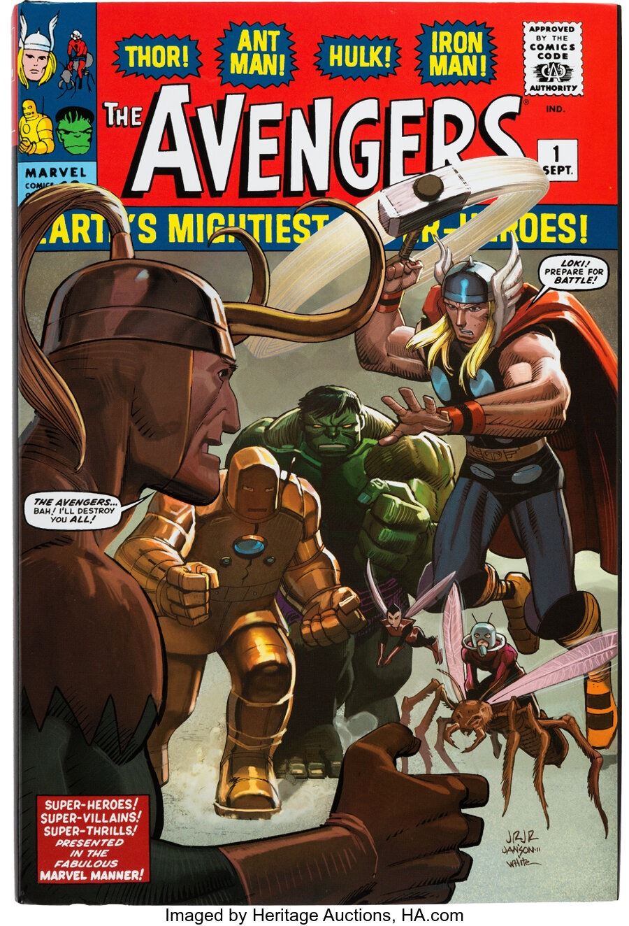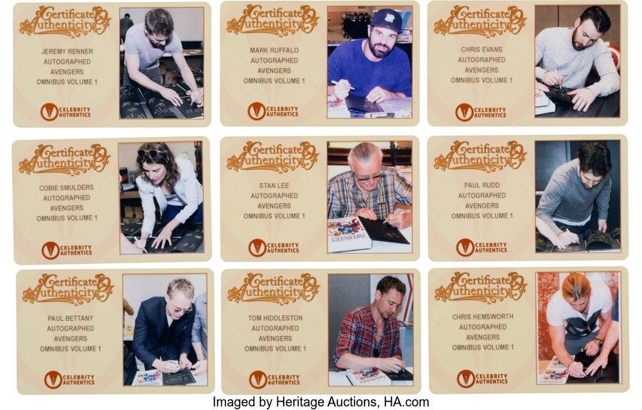 The AvengersOmnibus Vol. 1 Hardcover Signed By Cast Members of the Avengers Film Franchise. A 2011 hardcover version of The Avengerscomics (collecting the first 30 issues) with signatures from the film adaptation franchise. Each signature comes with a COA card (with a pic of the book getting signed) from Celebrity Authentics. Signatures include: Jeremy Renner, Paul Bettany, Mark Ruffalo, Chris Evans, Paul Rudd, Cobie Smulders, Stan Lee, Tom Hiddleston, and Chris Hemsworth. In Fine condition. COA from Heritage Auctions.