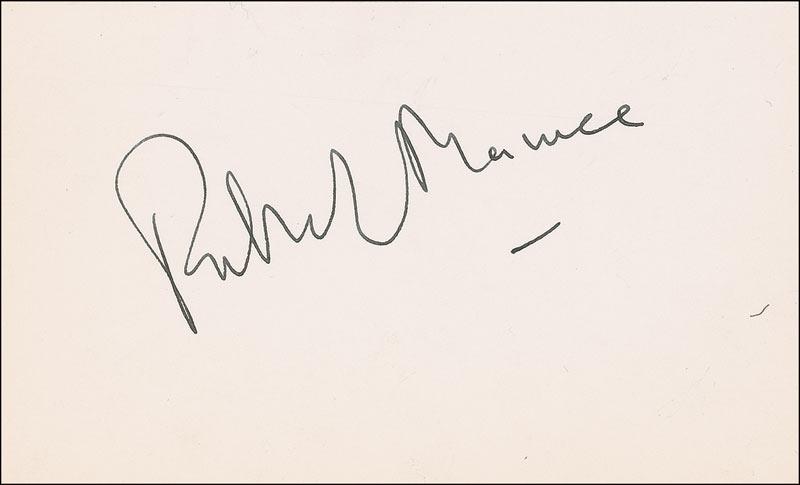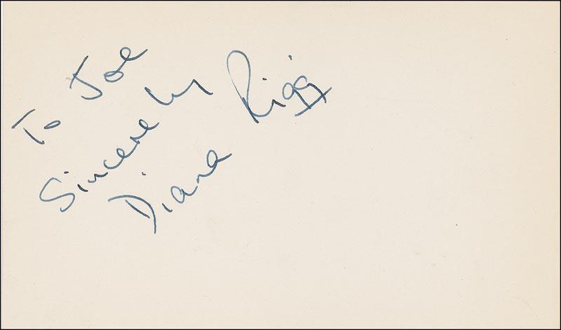 In-person ink signatures, “Patrick Macnee,” and “To Joe, Sincerely, Diana Rigg” on individual off-white 5 x 3 cards. In fine condition, with a bit of mild toning to Rigg’s card.