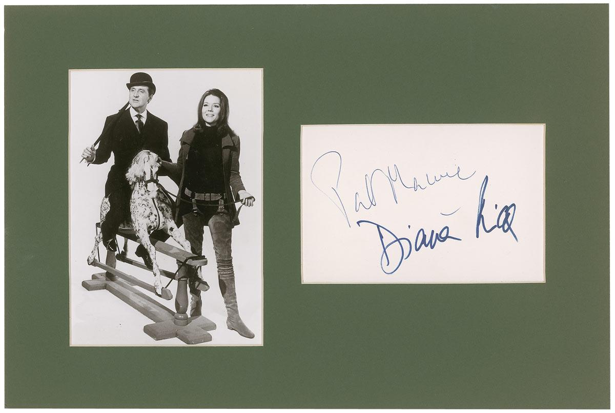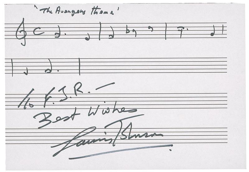 Two items: ballpoint signature “Patrick Macnee” and a felt tip signature “Diana Rigg” on an off-white 4 x 6 card, and matted with an unsigned photo to an overall size of 13.75 x 9.25; and an AMQS on a 6 x 4 slip of preprinted manuscript paper, four measures of the theme from the Avengers television series, signed and inscribed in black felt tip, “To F.J.R.—Best wishes, Laurie Johnson.” In very fine condition.