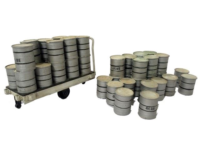 The scenes that feature Howard Hughes mammoth plane, "The Hercules" (known more commonly as "The Spruce Goose") under construction in the factory, a 1:16 scale model of the plane under construction and the factory was created. These glue drums and cart we used as set dressing in the factory. Fabricated from cast resin and styrene and features dry rub transfer graphics. 7" long x 3" tall (lot). 1:16 ratio. This incredible, handmade miniature is from the celebrated collection of Academy Award winning New Deal Studios. New Deal Studios is a 21st Century Media Studio, unlike any in the world. A full-service film production and visual effects studio, with over 20 years of iconic imagery, New Deal Studios develops, designs, prototypes, and creates all types of high caliber media projects. Founded in 1995 by Matthew Gratzner, Ian Hunter and Shannon Blake Gans, this artist owned and operated independent studio, born in the heyday of visual effects, has truly evolved into the technology driven studio for the future, consistently delivering the perfect marriage of artistry and technology. Award winning credits by New Deal Studios include high-profile projects such as Dark Knight Rises, Hugo, The Avengers, Oz the Great and Powerful, Iron Man, The Dark Knight, Watchmen, I am Legend, Night at the Museum, Whiteout, 2012, Alice in Wonderland, Inception, Battleship and Interstellar.