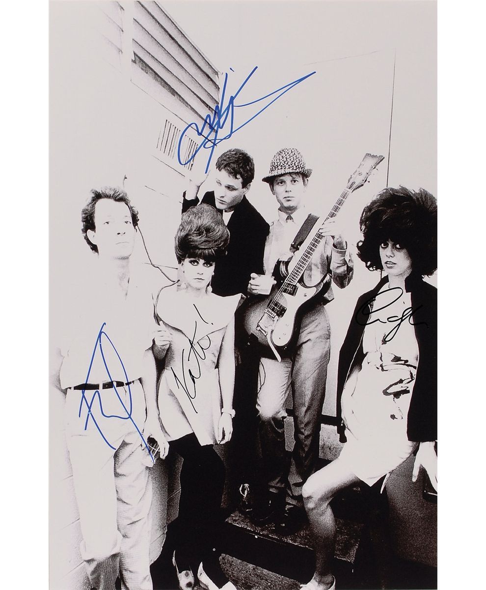 Glossy 12 x 18 group photo, signed in blue and black felt tip by Fred Schneider, Kate Pierson, Cindy Wilson, and Keith Strickland. In fine condition.