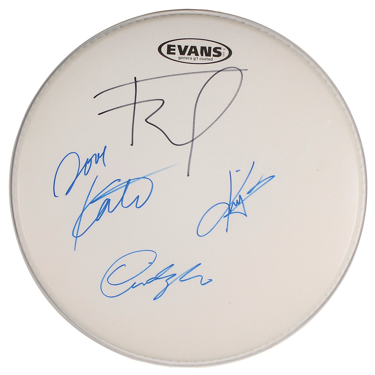 Unused 14? coated Evans drumhead, signed in black felt tip by Fred Schneider and in blue felt tip by Kate Pierson, Cindy Wilson, and Keith Strickland. In fine condition, with a few spots to right side.