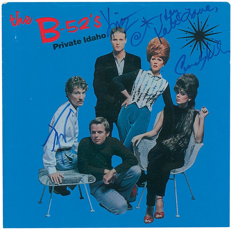 Color 45 rpm record sleeve for ‘Private Idaho,’ signed on the front in blue felt tip by Fred [Schneider], Kate [Pierson], Cindy Wilson, and Keith [Strickland]. In fine condition, with some scattered light creasing to edges. Accompanied by a letter of authenticity from James Spence and a full letter of authenticity from Roger Epperson/REAL.