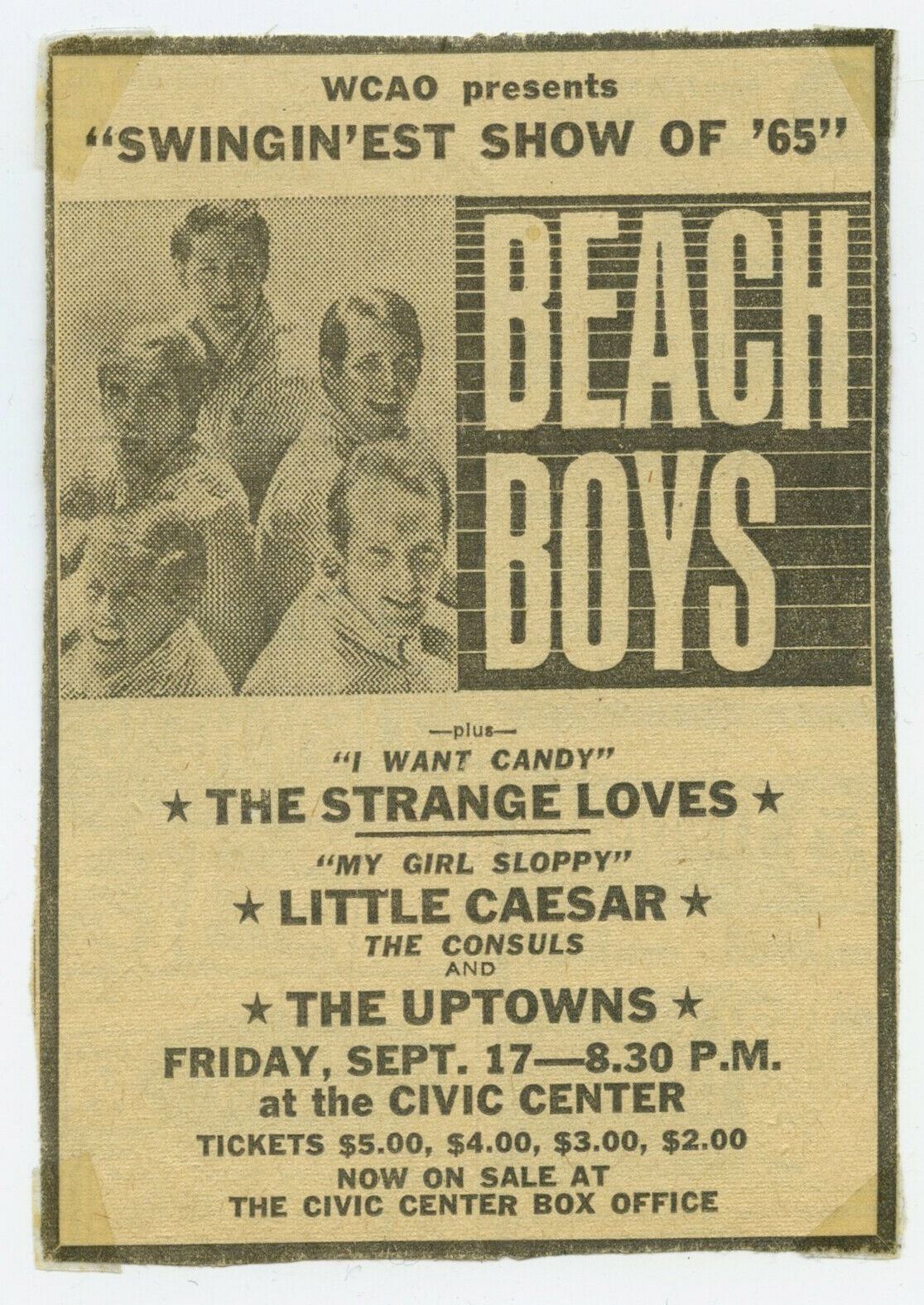 IN PERSON - THE BEACH BOYS, The Strange Loves, Little Caesar, The Uptowns appearing September 17, 1965 at the Civic Center (now called the Baltimore Arena) in Baltimore, Maryland.