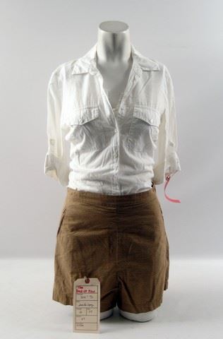 Zoe's (Jennifer Lopez) screen worn, hero, white cotton three quarter sleeve button front with cuffed sleeves ribbed 'James Perse' shirt, (size 2) white ribbed cotton spaghetti strap five button 'Hanro' tank top, (size S) tank top, (size S) and caramel cotton seersucker high wasted with side zipper shorts. Includes wardrobe tag!