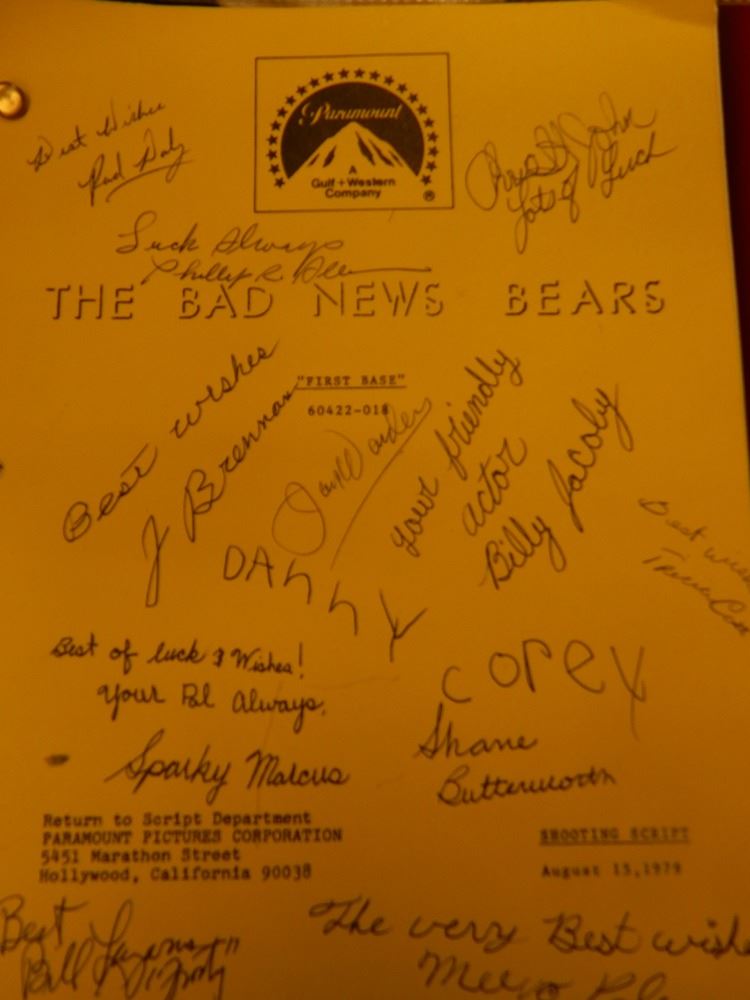 Original script for the episode First Base from the television series The Bad News Bears signed by Jack Warden, Phillip Allen, Bill Lazarus, Tricia Cast, Sparky Marcus, Meeo Peluce, Bill Jacoby, Christoper St. John, Shane Butterworth, Corey Feldman, Rad Daly, Danny Nenuz, and Tonya Crowe. All items come with a certificate of authenticity good for the life of the piece.