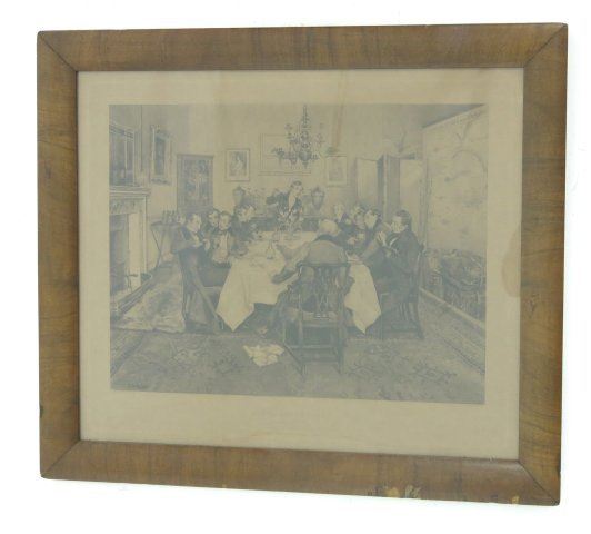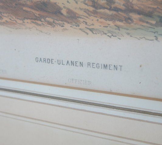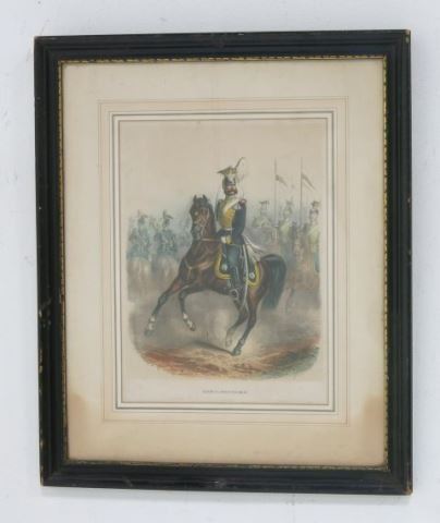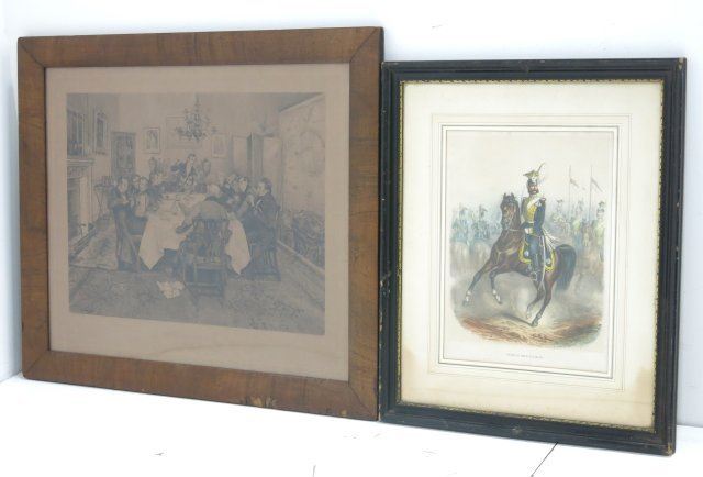 Larger, "The Bagman's Toast" after W. Dendy Sadler. Seal lower left, L.H. Lefever, St. James London. Approx. 18" x 24" sight, 29" x 33" framed. Smaller, "Garde Ulanen Regiment". Color print, France. Approx. 16" x 12" sight, 26" x 22" framed Damages to frame of larger, foxing to liner of smaller