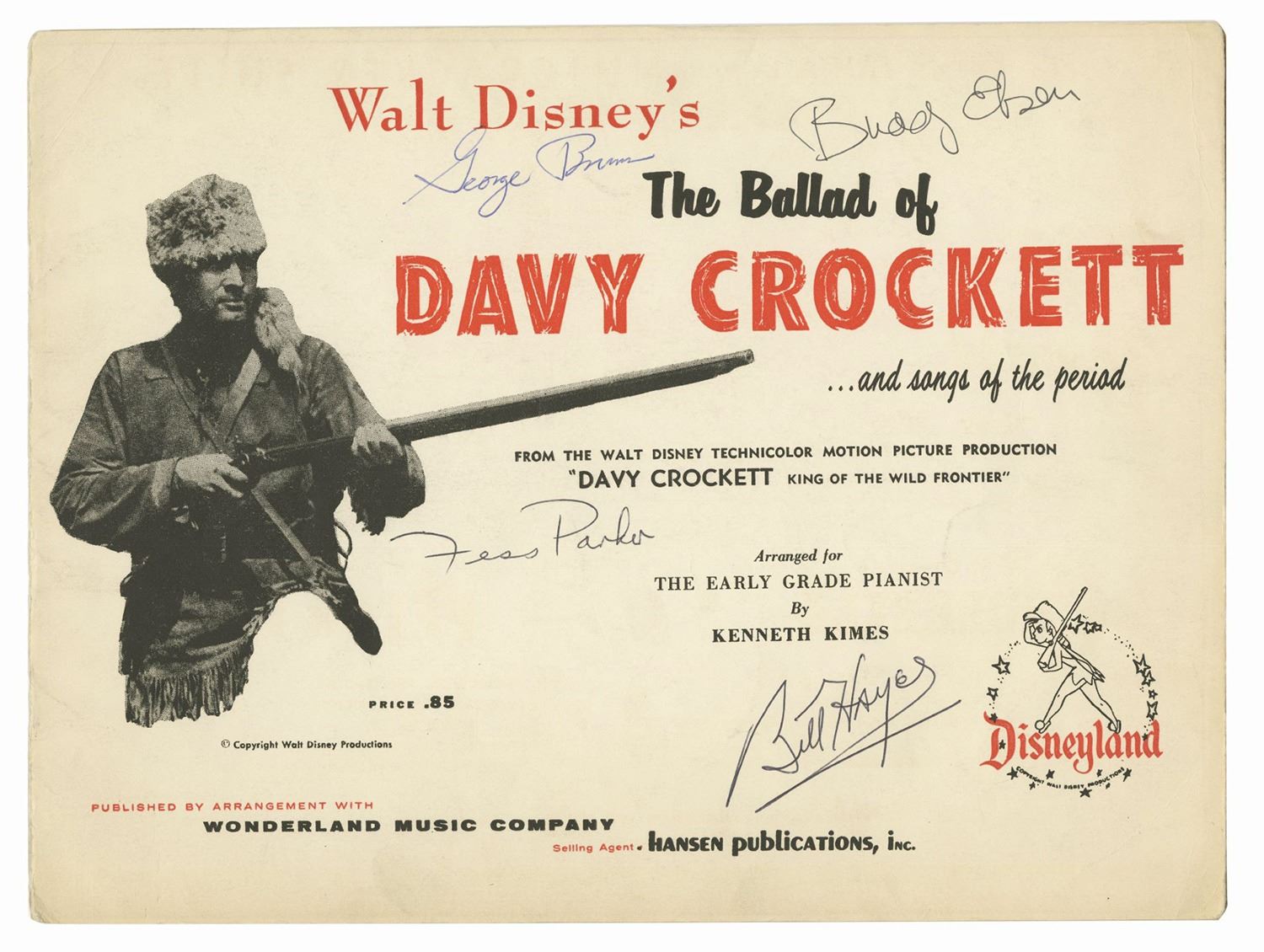 (Disney, 1955) A multi-signed song book titled "The Ballad of Davy Crockett" based on the popular television show. The cover is signed by Fess Parker, who portrayed Crockett, as well as actor Buddy Ebsen, vocalist Bill Hayes, and composer George Bruns. In addition to the cover signatures, each individual also signed an interior page. Two of the autographs are dedicated "To Alan." Measuring 9"x12", the 16-page song book is in good condition with discoloration and edge-wear, particularly along the spine where there is tearing from age and use.