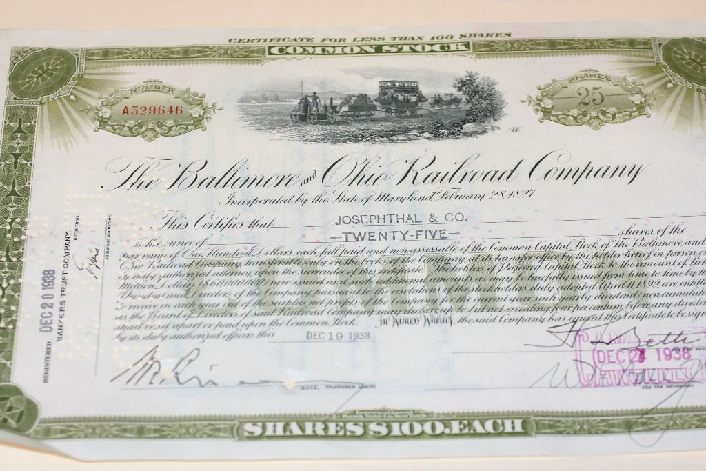The Baltimore and Ohio Railroad Co. Stock Certificate Dated 1938