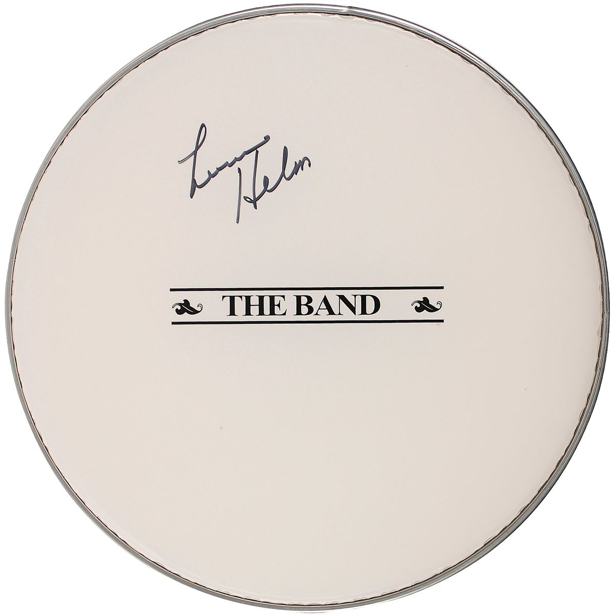 Unused off-white 13? drumhead, with the band’s name across the middle, signed in black felt tip by Helm. In fine condition.
