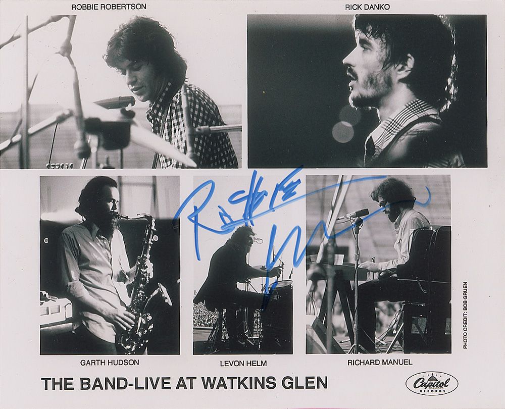 Glossy 9.75 x 8 Capitol Records composite publicity photo of The Band, signed in blue felt tip by Robertson. In fine condition, with one slight surface crease.