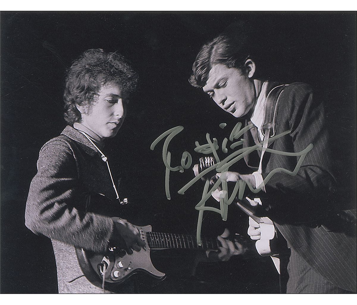 Satin-finish 10 x 8 photo of Robertson on stage with Bob Dylan, signed in person in silver ink. In fine condition. Originally obtained by in-person specialist Mike Wehrmann.