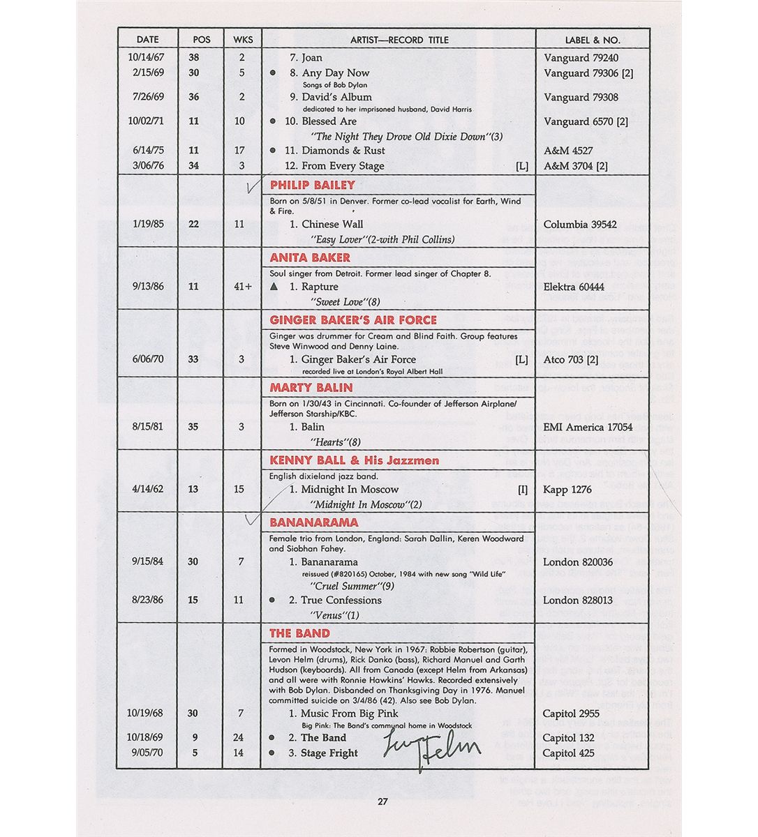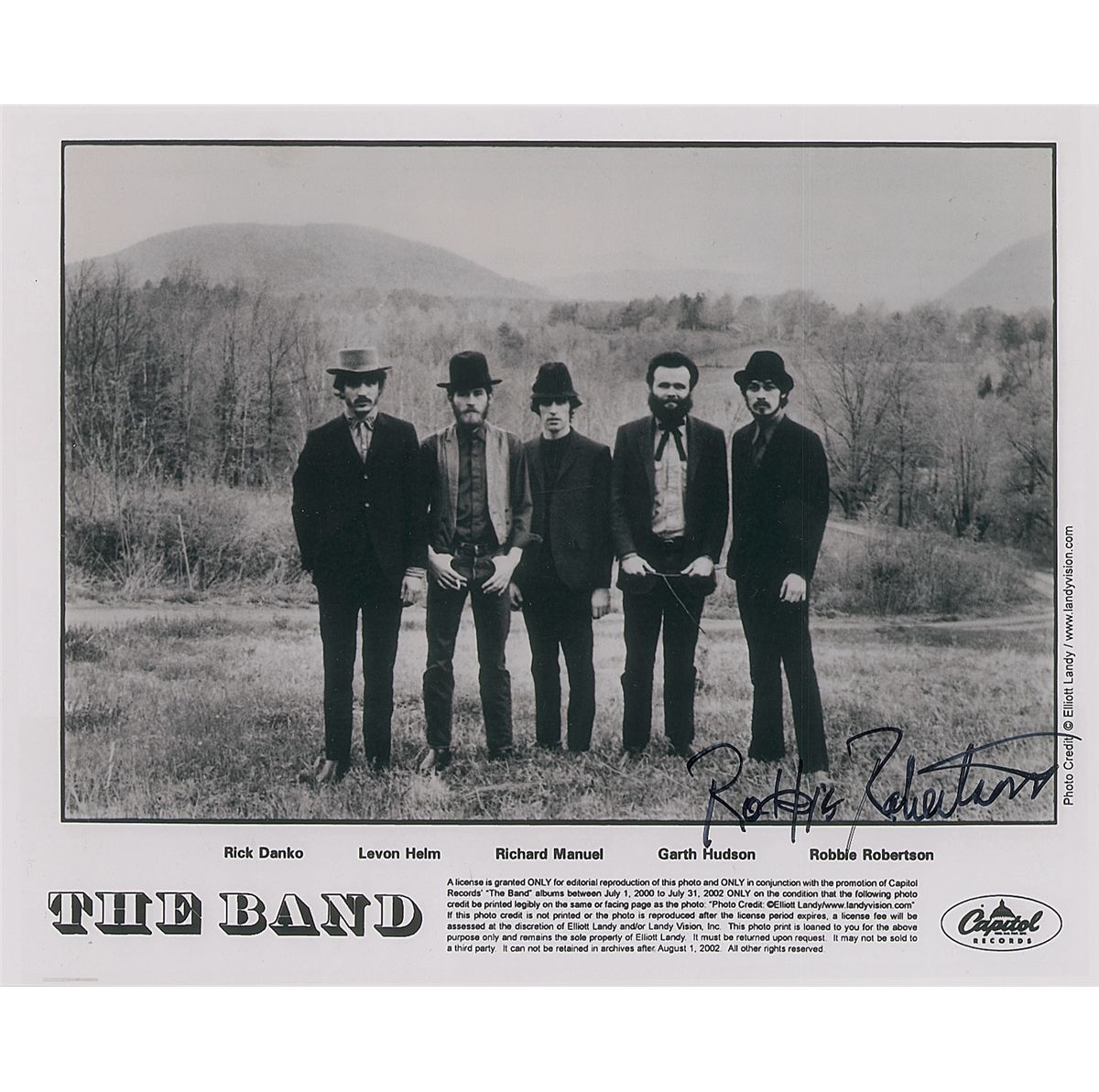 Glossy 10 x 8 Capitol records group publicity photo, signed in black felt tip by Robbie Robertson; and a book page from a Billboard artist’s compilation, signed in black ink by Levon Helm at the beginning of the group’s listing. In very fine condition.