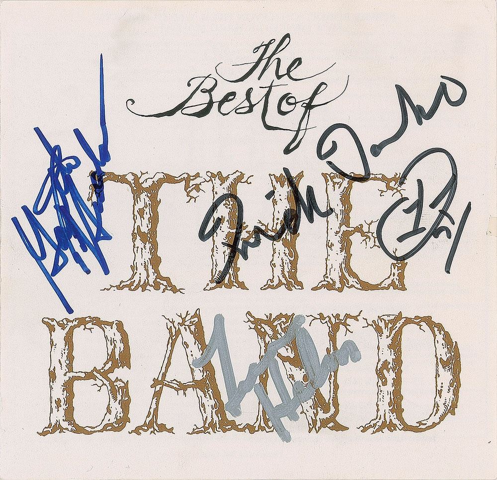 The Best of The Band CD booklet signed on the front in black felt tip by Rick Danko, in blue felt tip by Garth Hudson, and in silver ink by Levon Helm. In fine condition. The CD is not included. Accompanied by two photos taken at the time of the Helm and Danko signings.