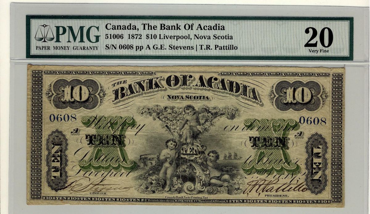 The Bank of Acadia, 1872 $10 #0608, CH-05-10-06. PMG VF20. Only 8 examples known. Possibly the finest. Simply a splendid example, one of unforgettable quality and a highlight of this sale. Very rare.