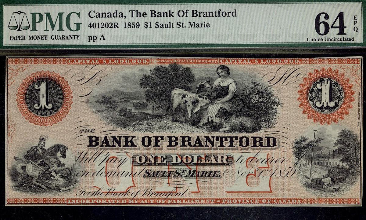 The Bank of Brantford 1859 $1 CH-40-12-02R PMG UNC64EPQ.