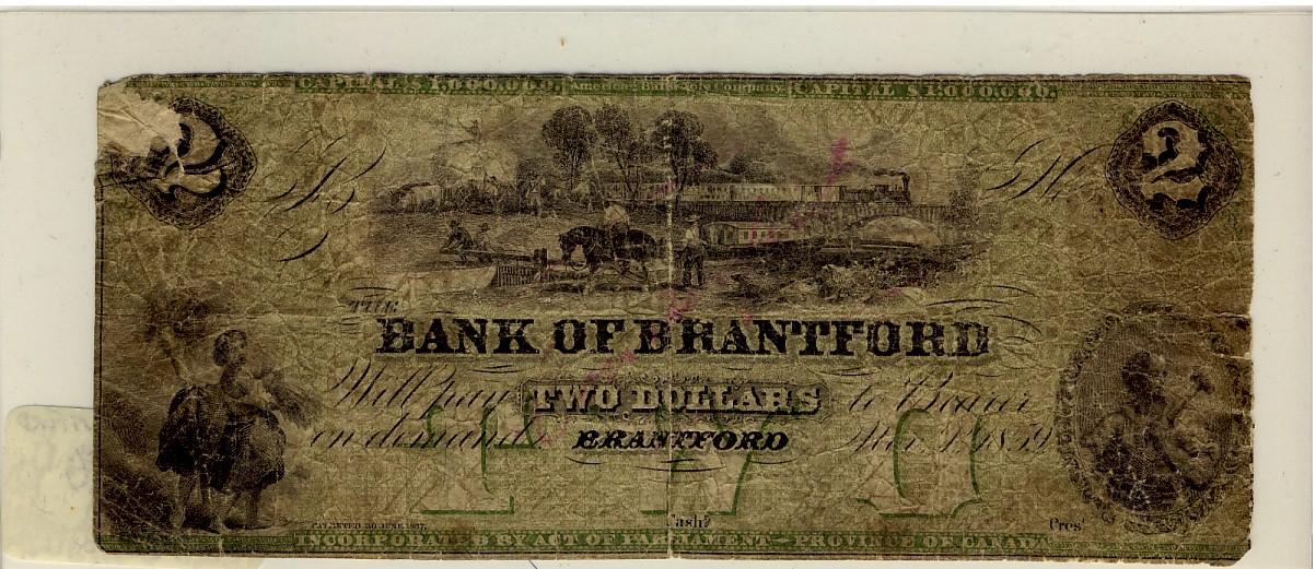 The Bank of Brantford 1859 $2, CH-10-04-04, G-VG, top right corner missing.